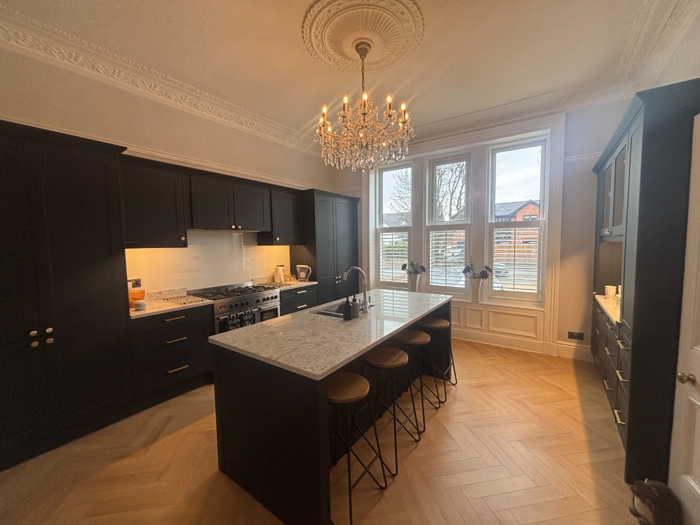 • KITCHEN/diner with all modern appliances including double electric range oven, 5 ring gas hob, island with 4 chairs, dishwasher, (NO microwave), grill, coffee machine