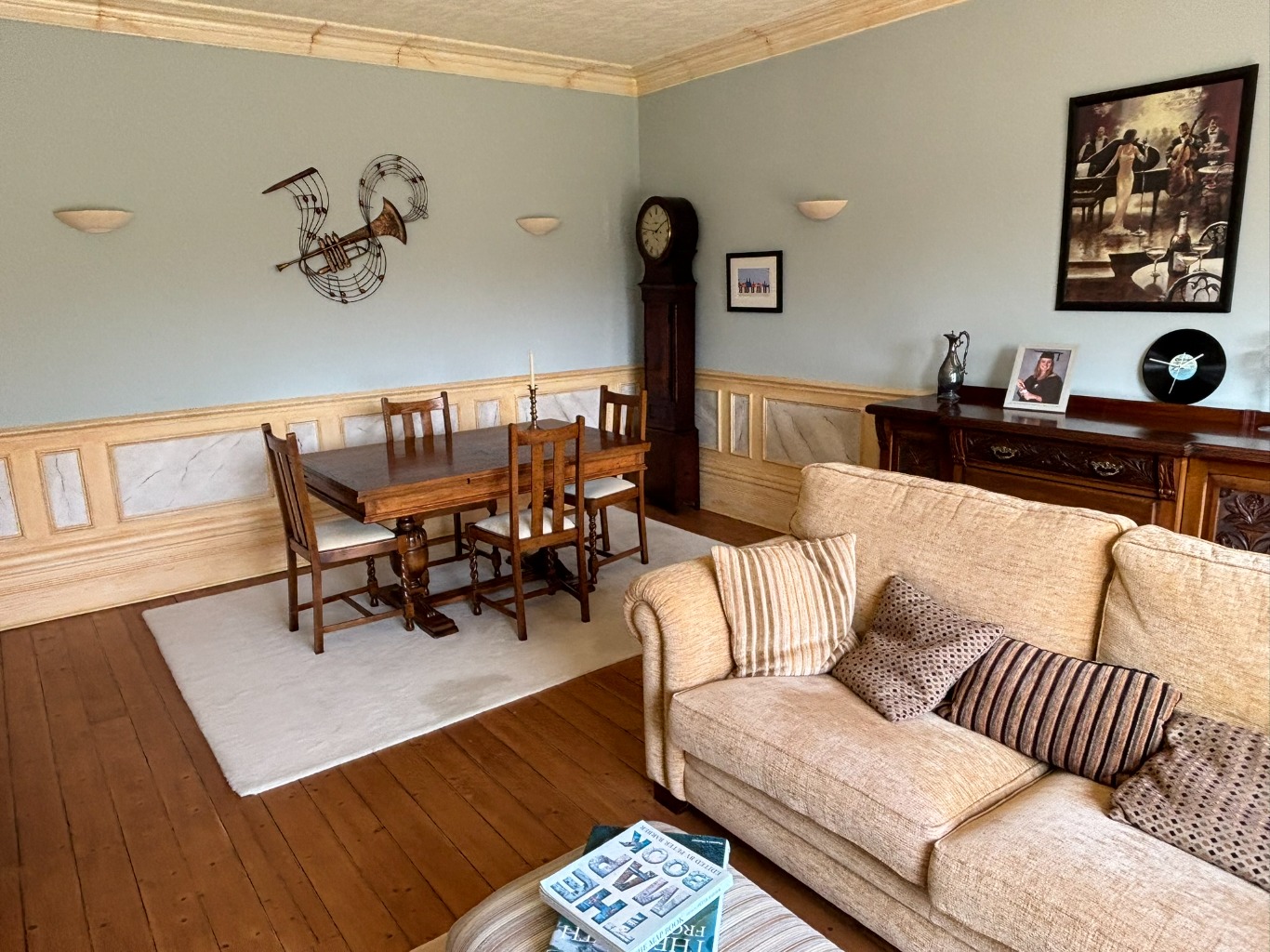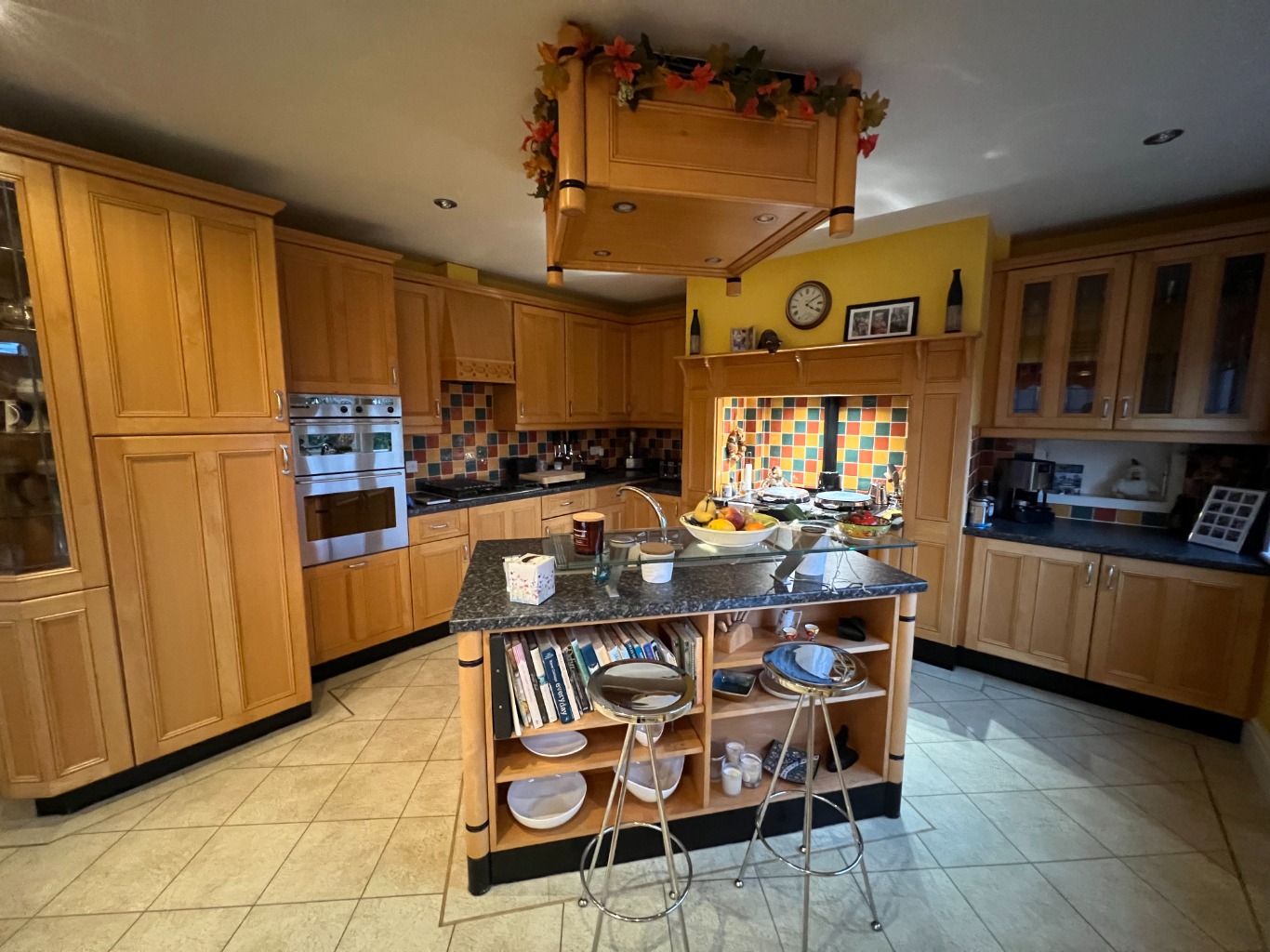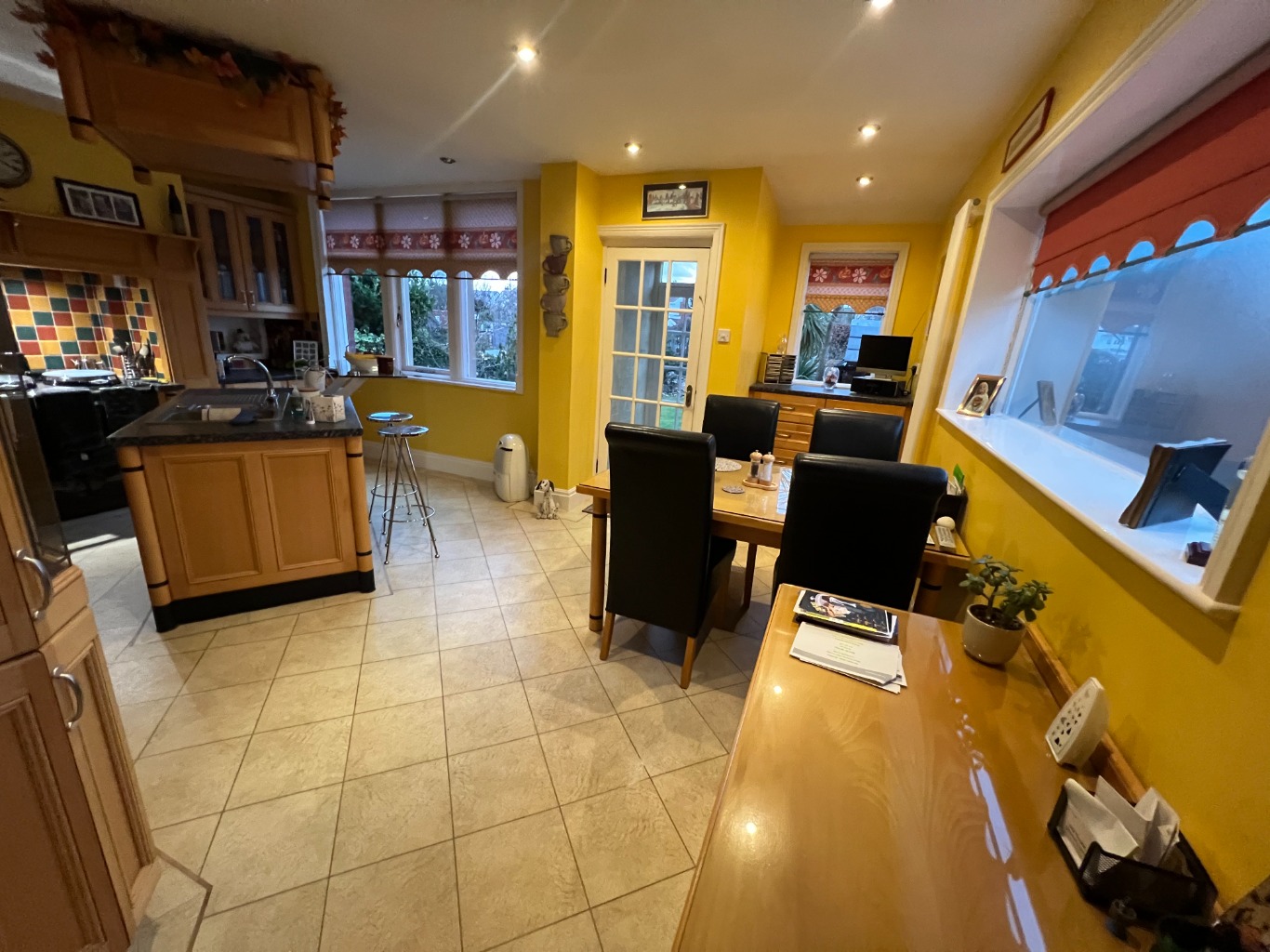 – Kitchen Diner with double electric oven, aga, gas hob, fridge freezer, coffee machine, microwave, dishwasher and smart TV. There is a breakfast island with 2 stools and a table with 4 chairs.