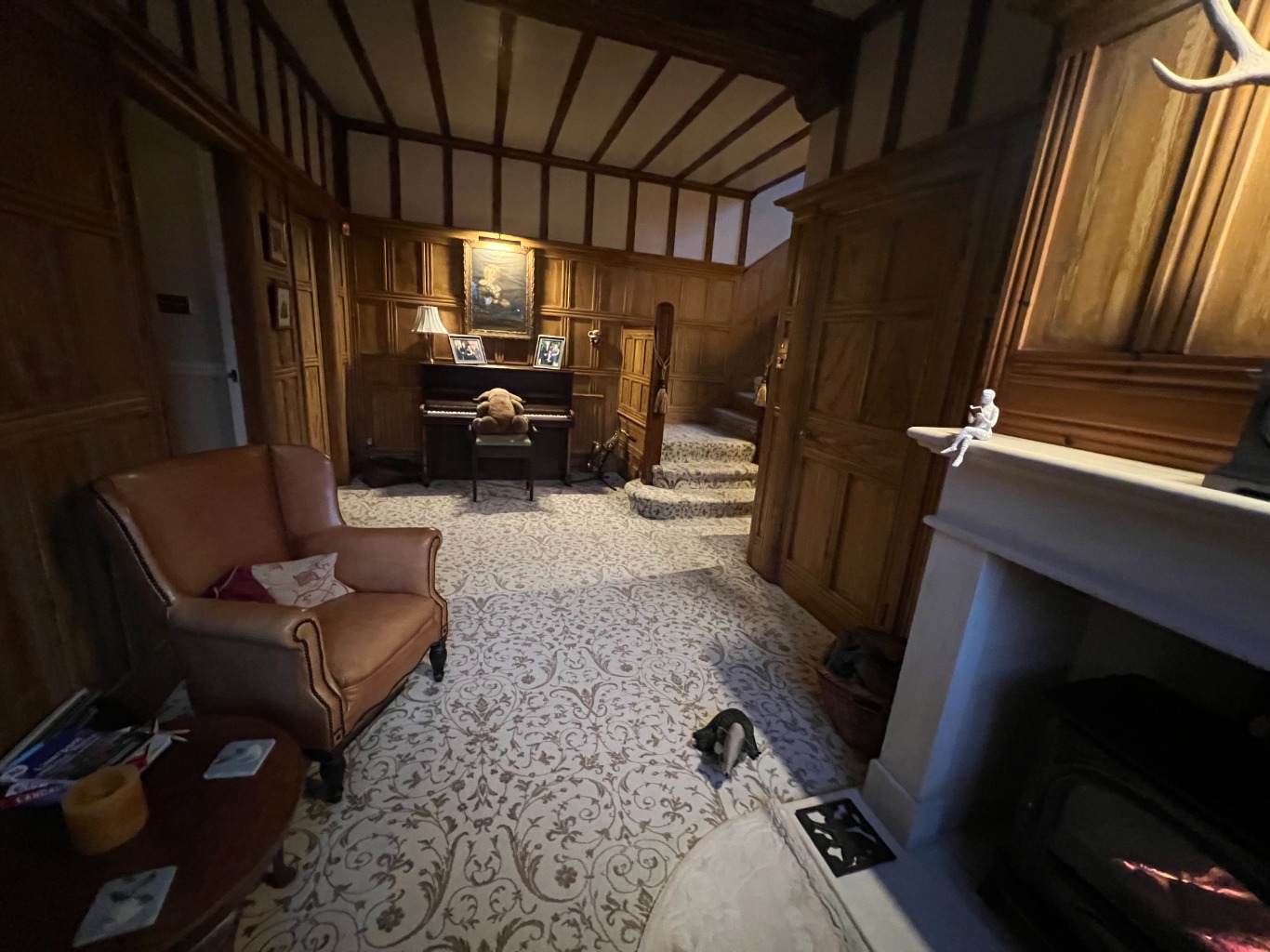– Entrance hall with stone fireplace, armchair and piano.