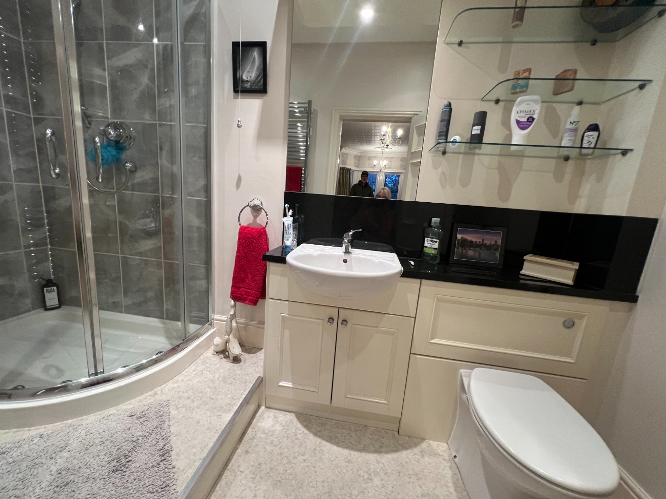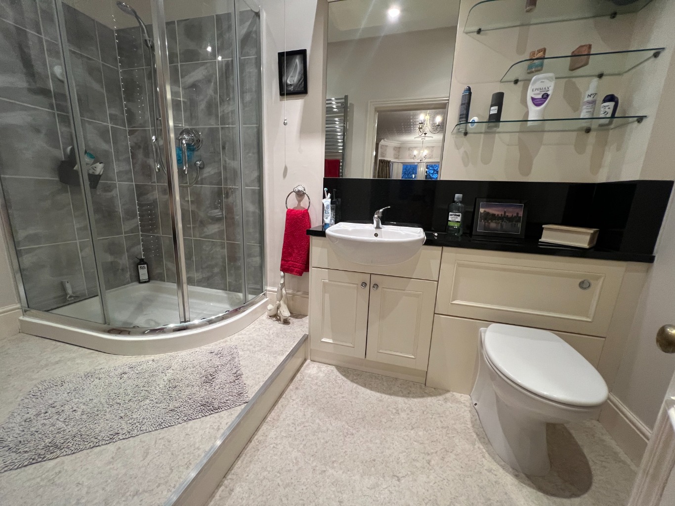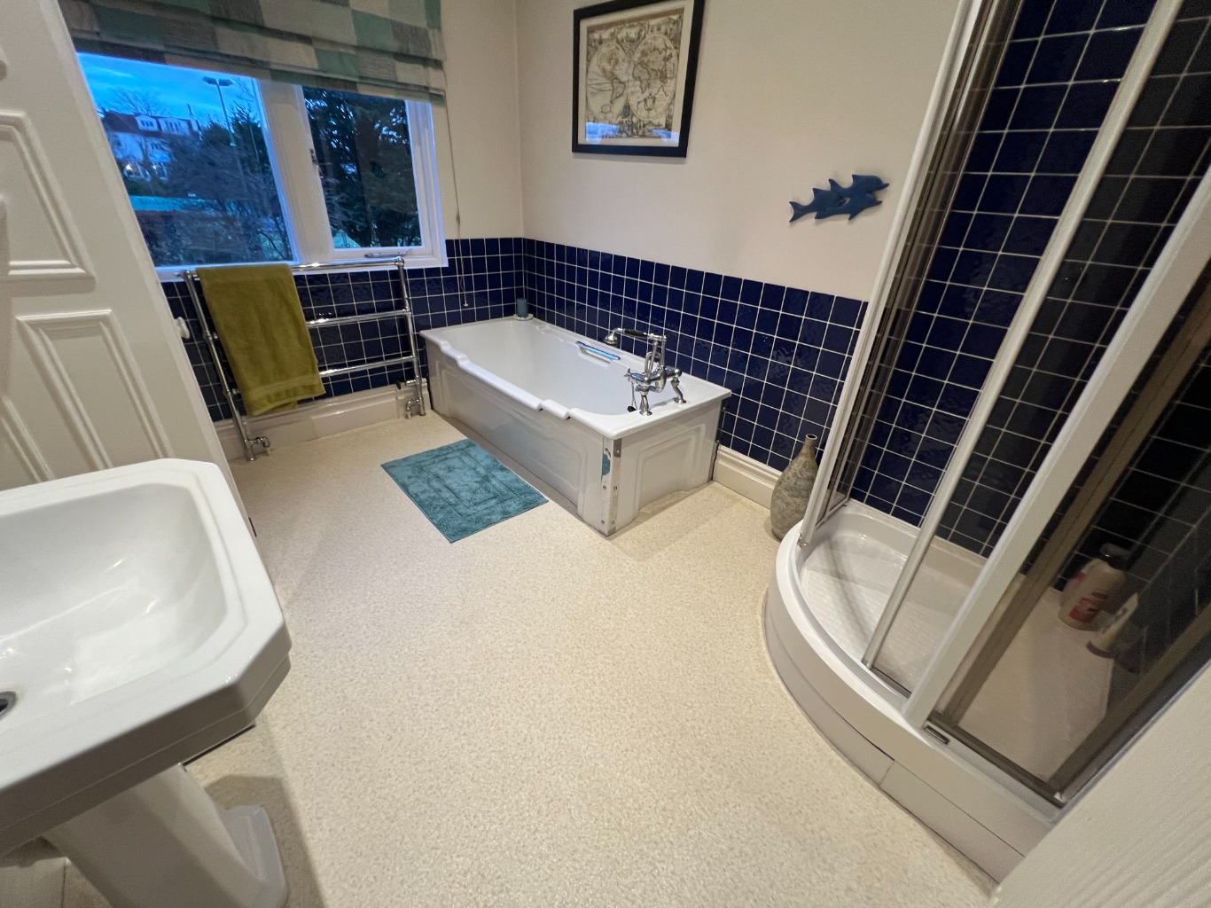– Bathroom with bath, basin, shower cubicle and heated towel rail.