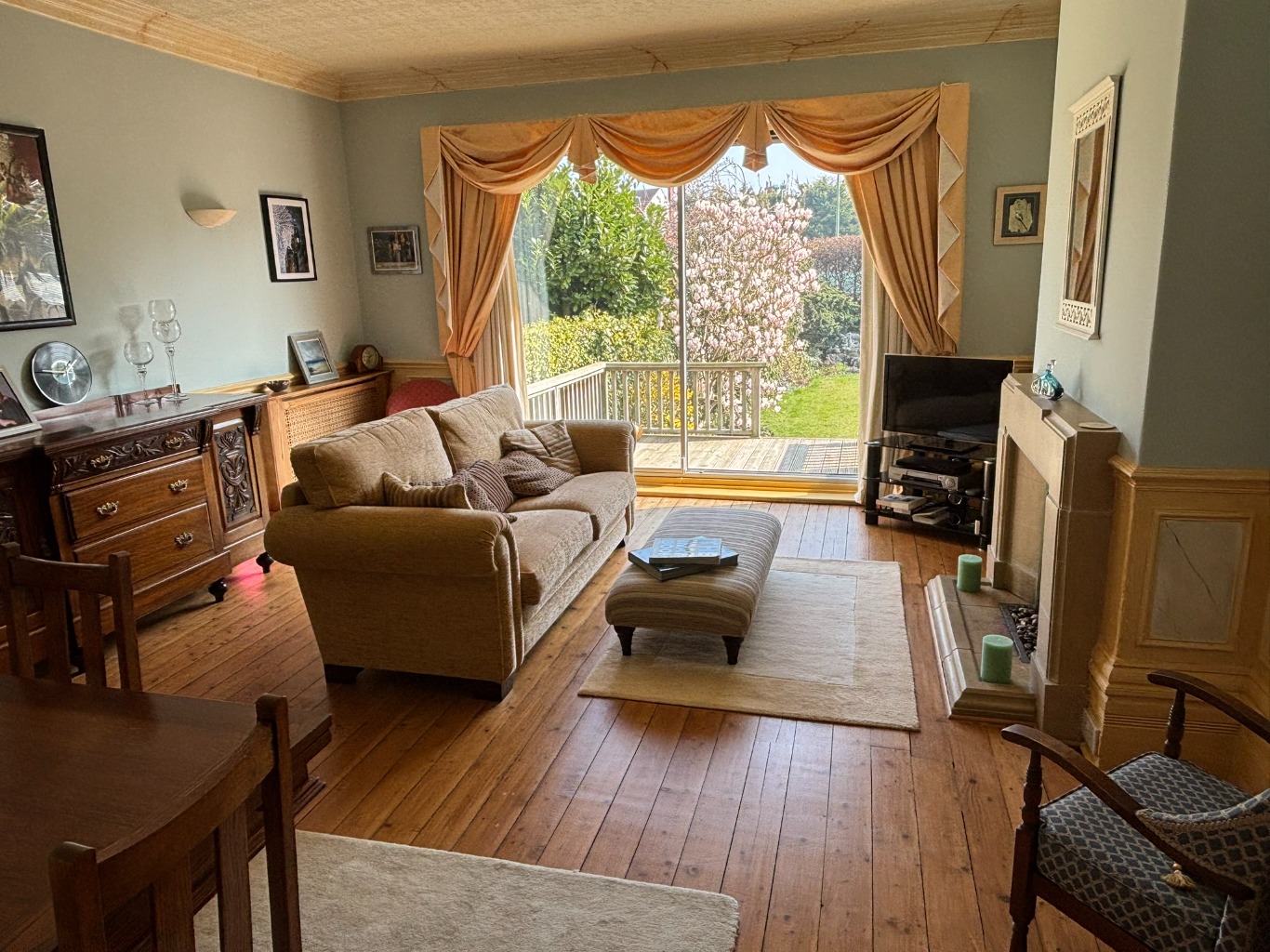 – Dining Room with table for 4, 2 seater sofa fireplace, tv and patio doors onto garden.
