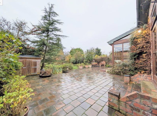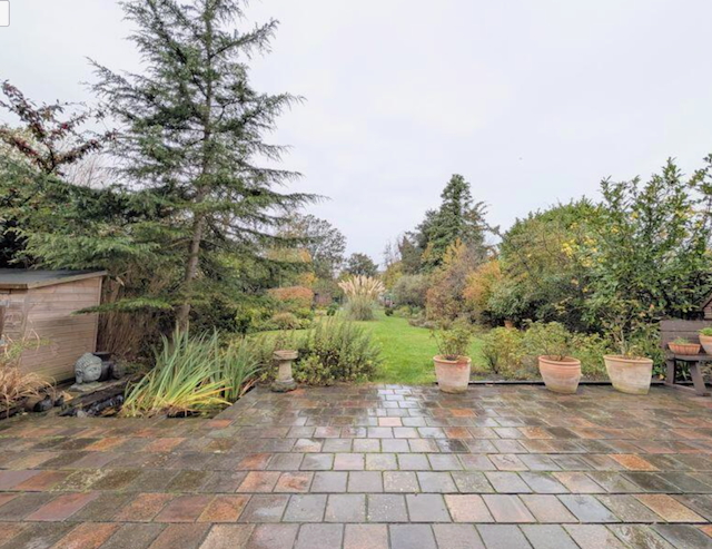 Large back garden with patio and garden furniture.