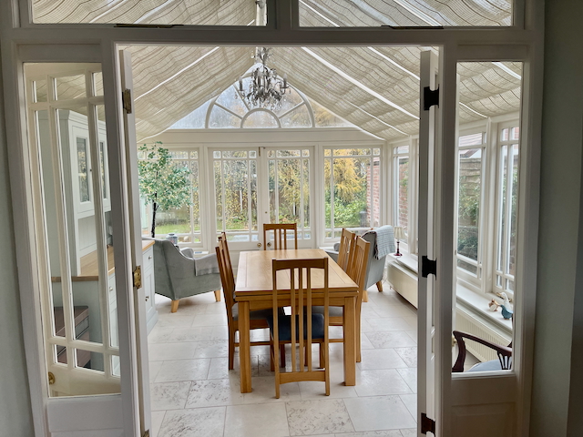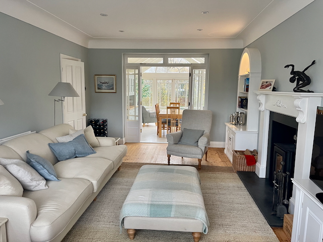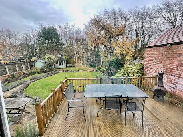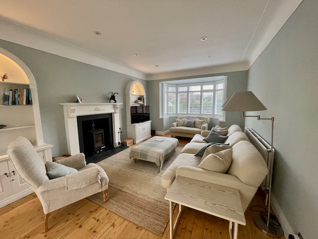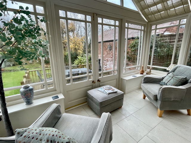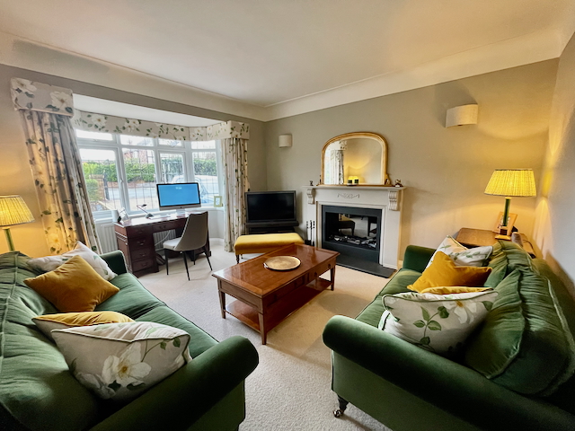 SITTING ROOM – 2 sofas, chair, gas fire, smart TV leading into a conservatory with dining table and chairs for 6/8 and 2 armchairs overlooking the garden. The Conservatory opens onto the enclosed rear garden and patio with garden furniture.