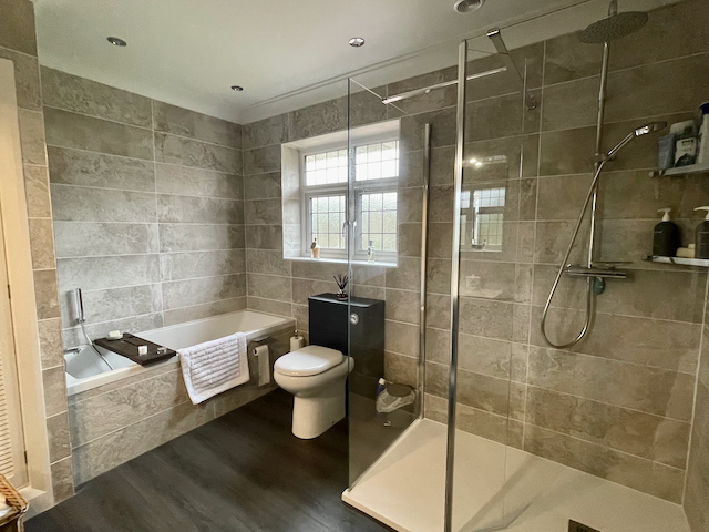 BATHROOM -bath with handheld shower, separate shower basin and WC