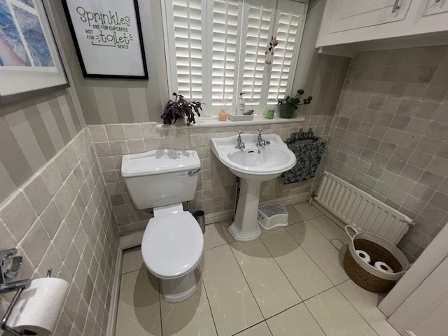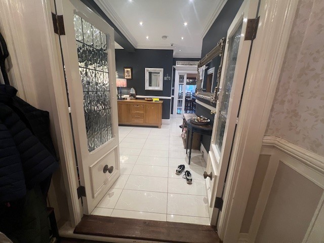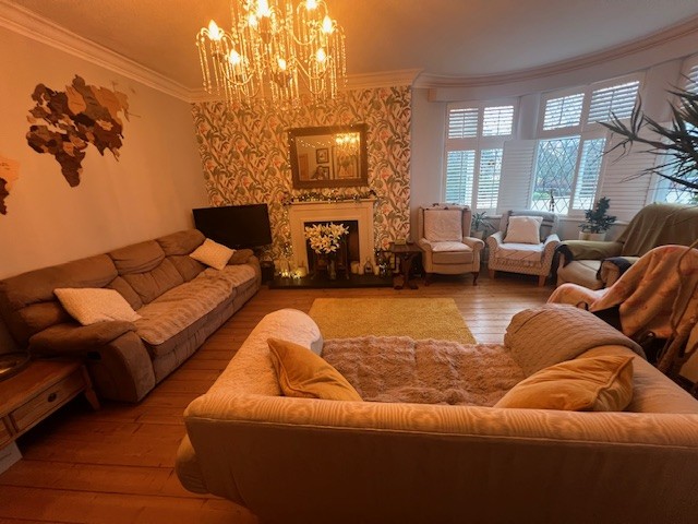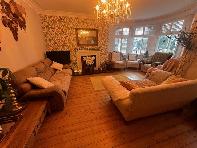 – Entrance Hall: currently used as an extra sitting room with Sky TV, L shaped sofa, 2 armchairs and an open fire.