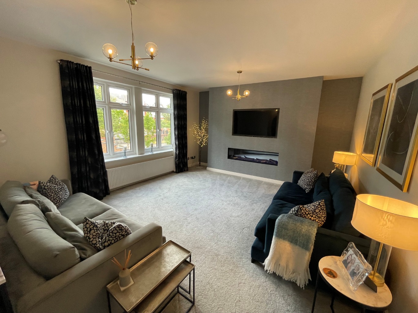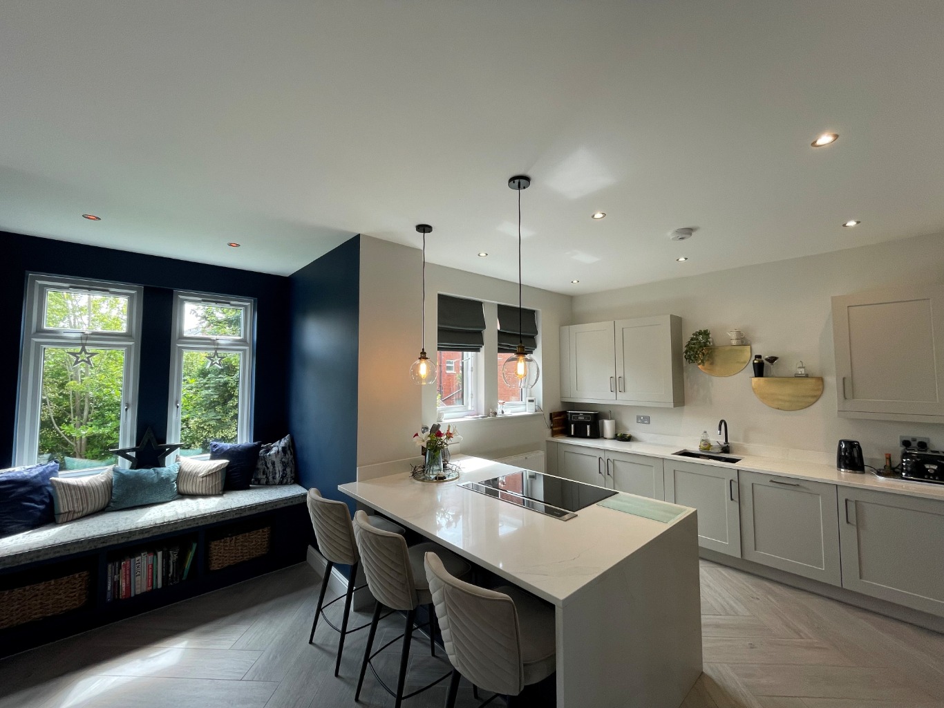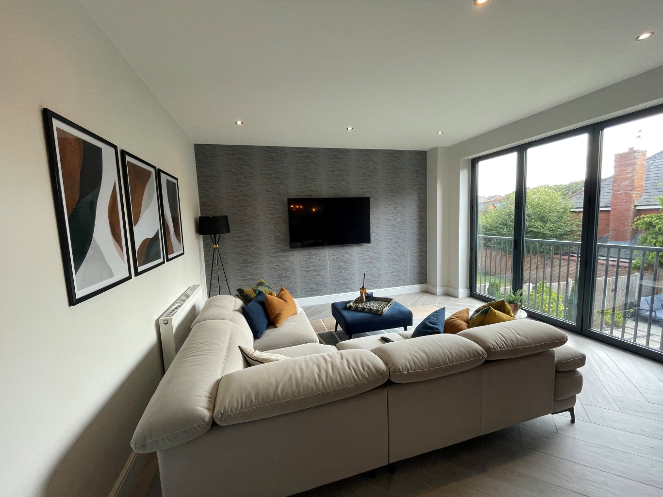 • OPEN PLAN – Kitchen/Lounge/Dining–with Island and seating for 3, dining table with seating for 8, induction hob with double oven, extractor hood, fridge/freezer, microwave, wine fridge, dishwasher and smart TV. There is Bifold doors with Juliette balcony .