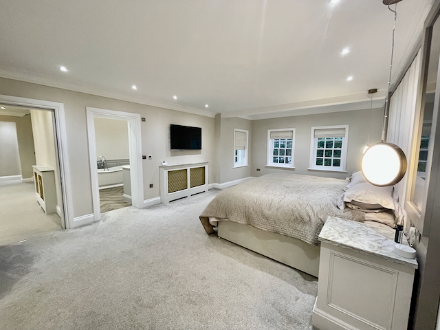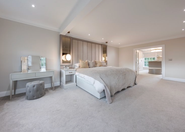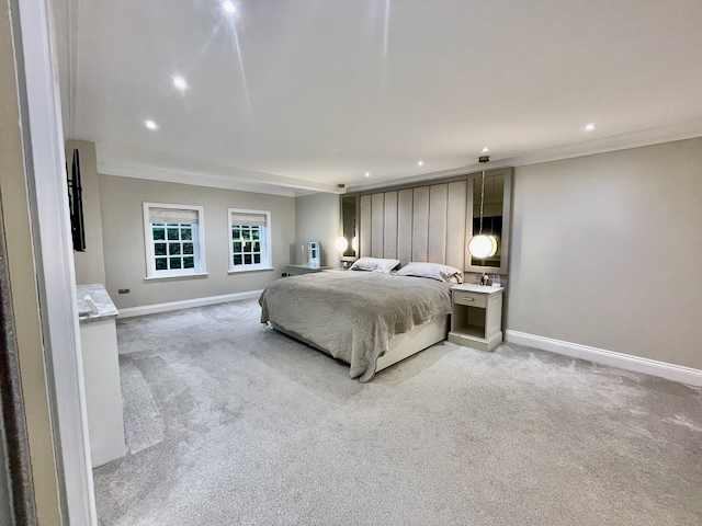 • BEDROOM 1 – ( master suite) Emperor size bed with wall mounted TV, dressing room and Ensuite bathroom with free standing bath shower and sauna, basin & W.C