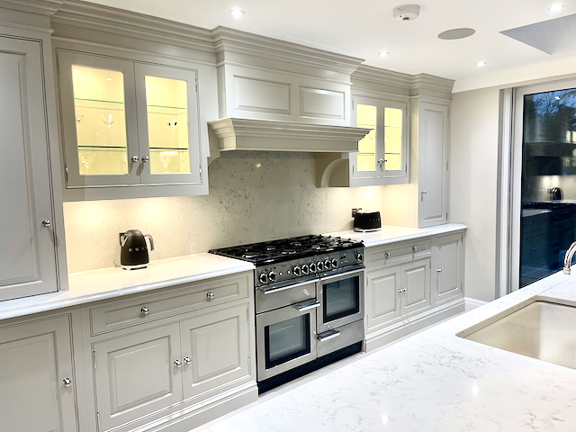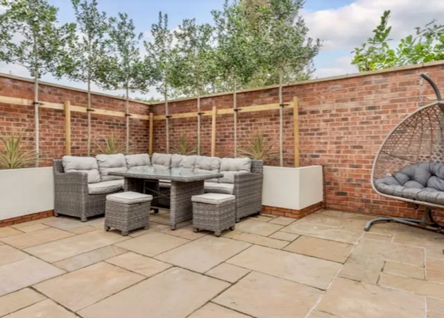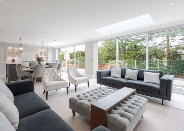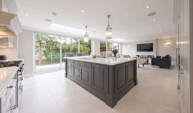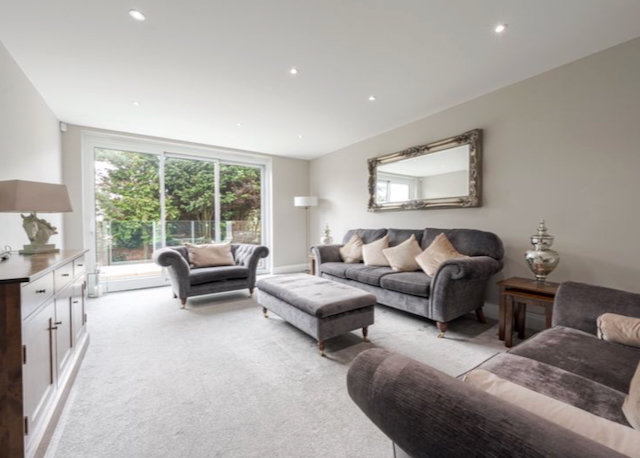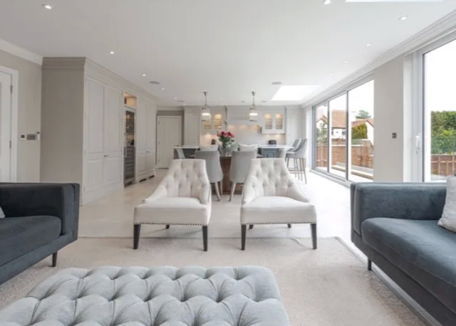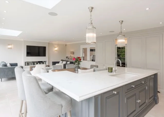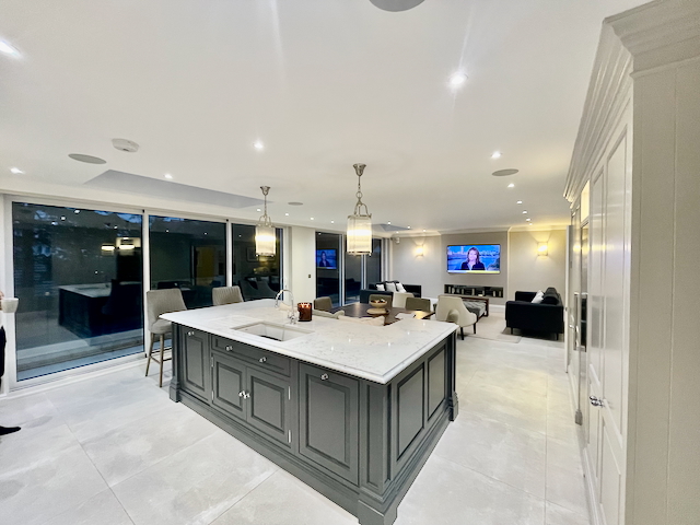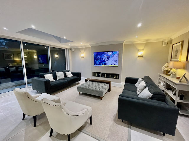 • KITCHEN/DINING/SITTING ROOM with all modern appliances including built in Sonos, 7 burner range master hob and double oven, dishwasher, wine fridge, island with 2 high chairs, dishwasher, microwave, dining table with fitted bench and chairs, 2 sofas, wall mounted 65 inch TV with Sky sport and 2 large sliding doors onto the balcony which leads onto the landscaped garden.