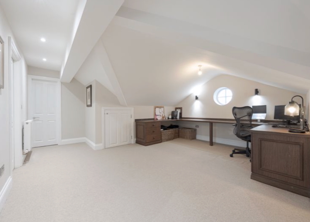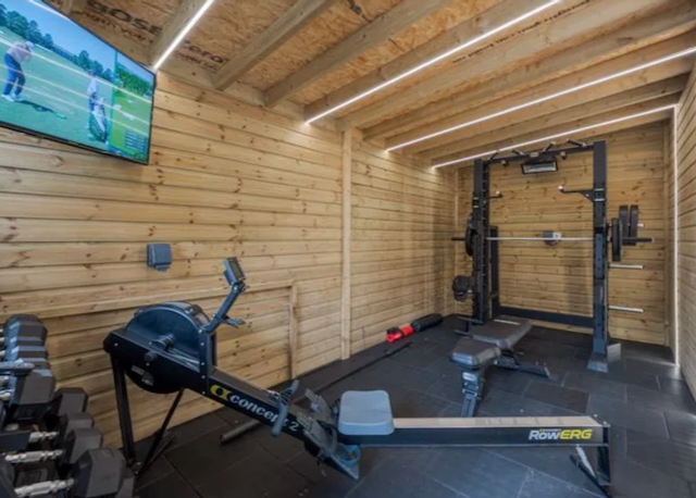 • GYM with – heated interior, gym matting, Primal squat rack and Smith machine, adjustable bench, dumbbell rack, Concept 2 rower, and Peloton bike, complemented by a 37” TV with Sky Sports, Wi-Fi, and Bose sound system.