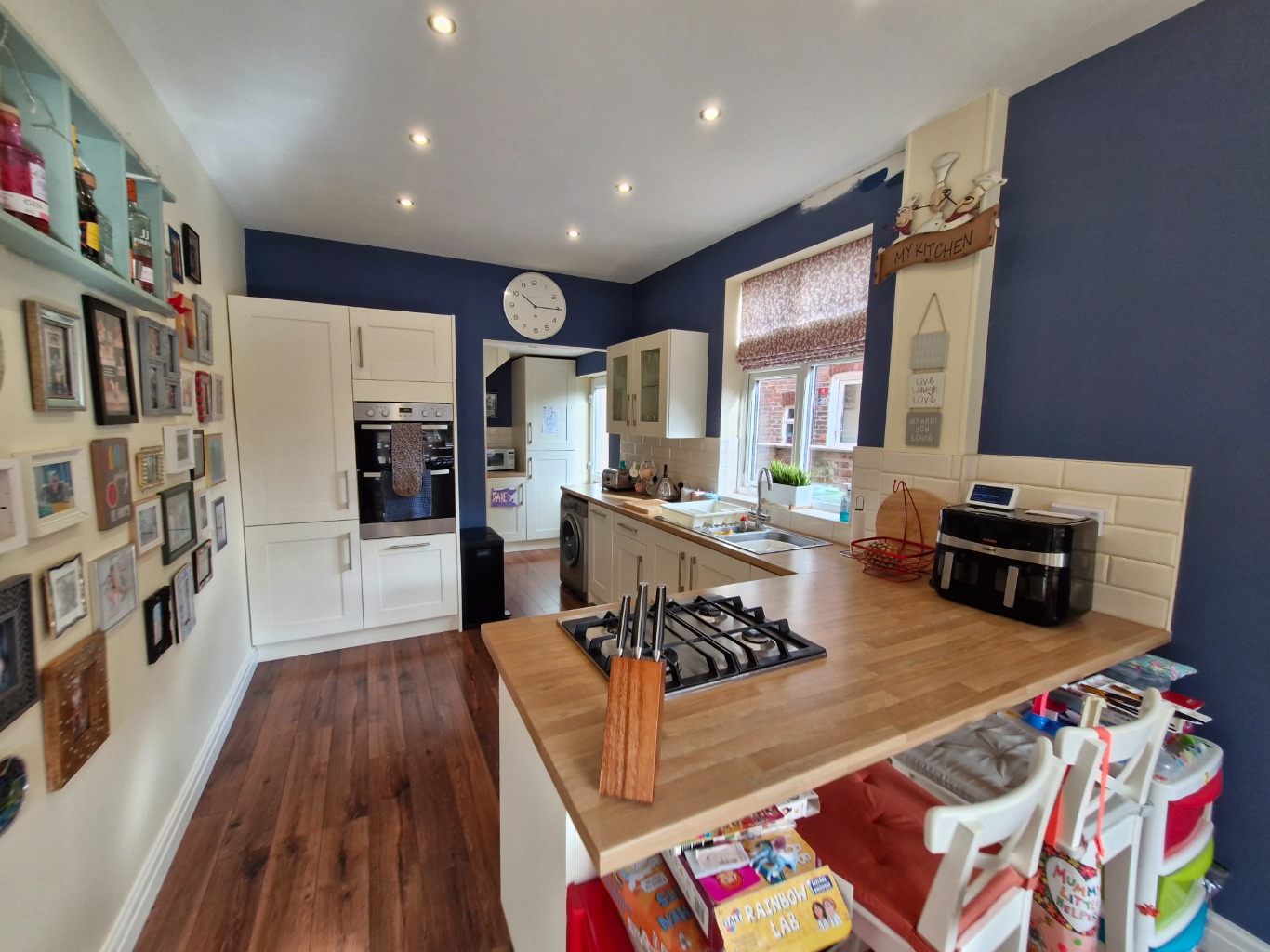 – KITCHEN/DINING includes: gas hob, extractor hood, double wall mounted oven, microwave, dishwasher, air fryer, fridge freezer and washing machine. The dining area has a wooden table and 6 chairs, with two additional stools at the breakfast bar.