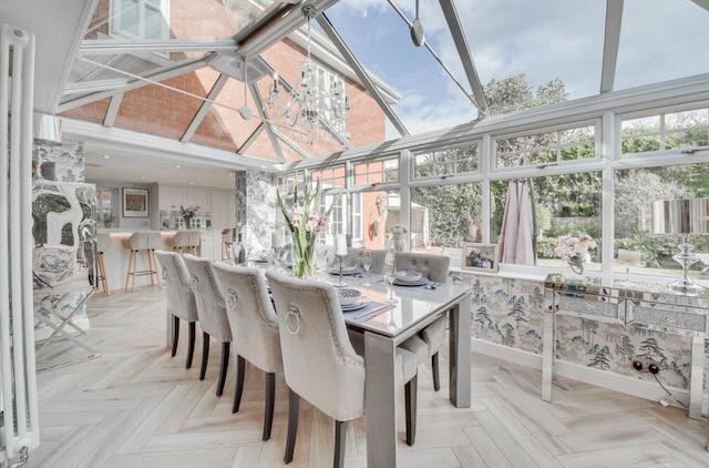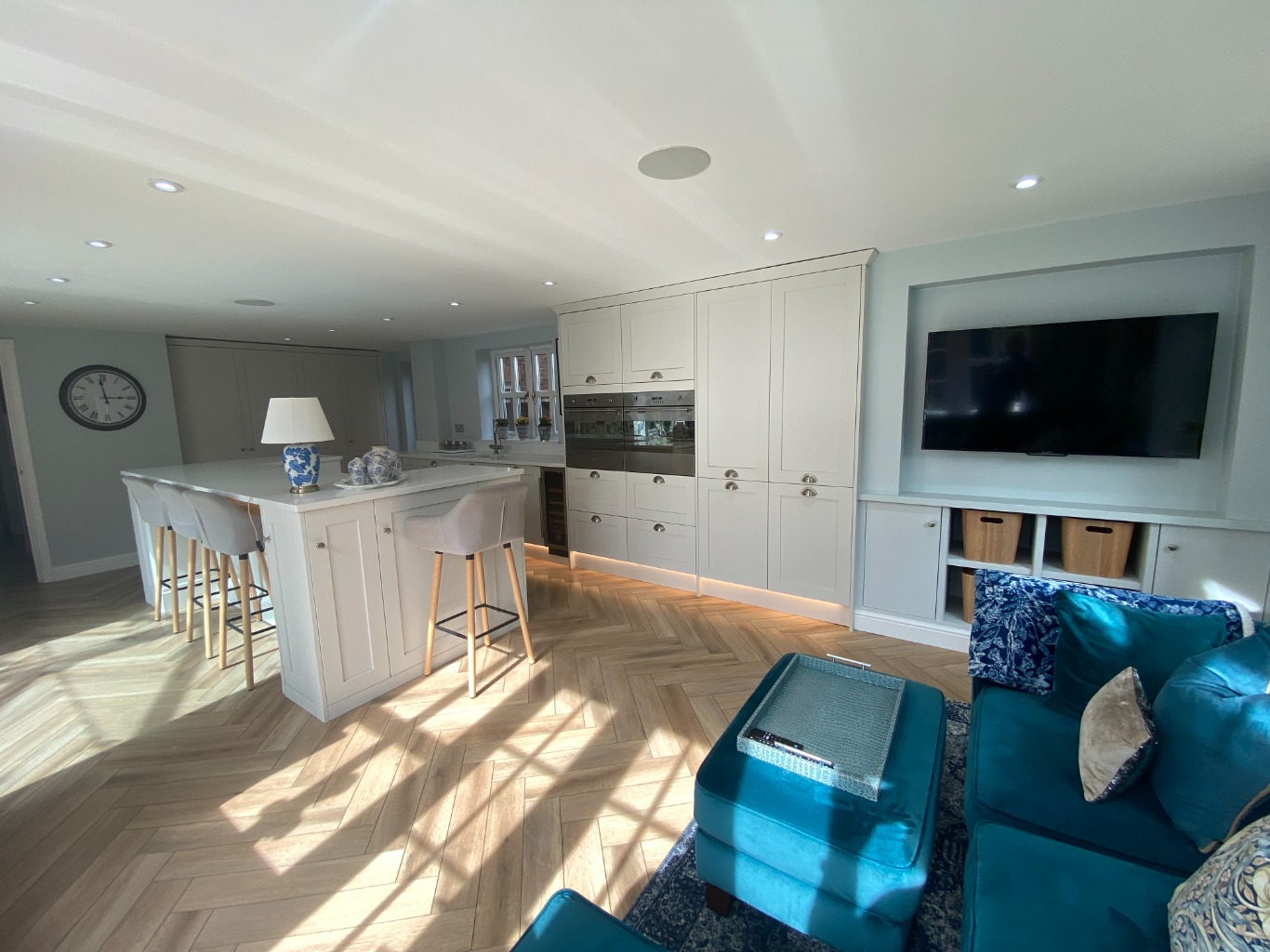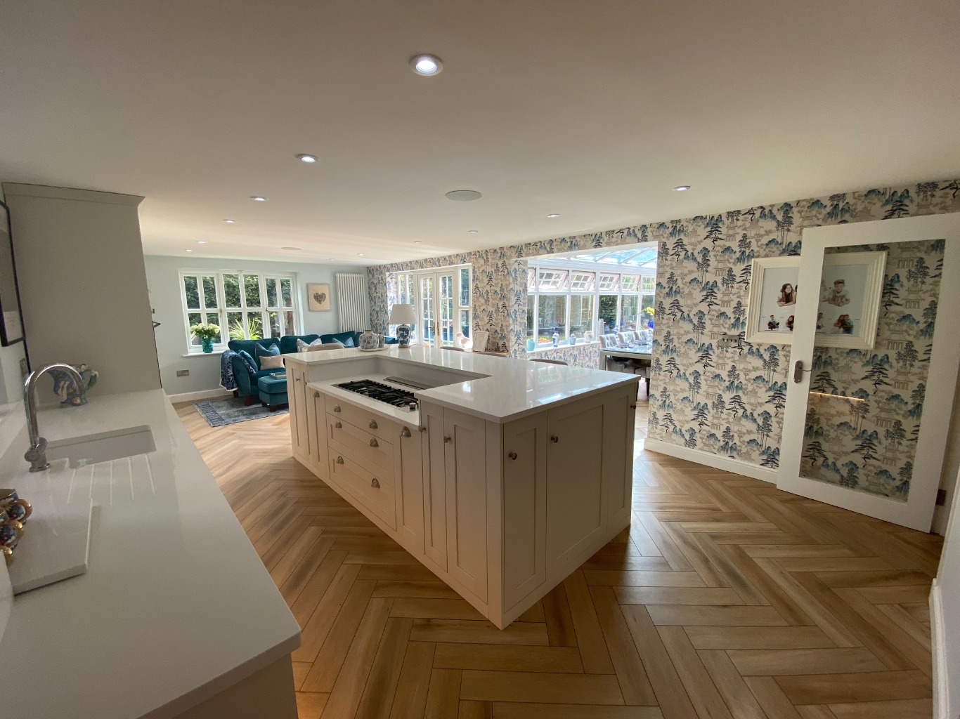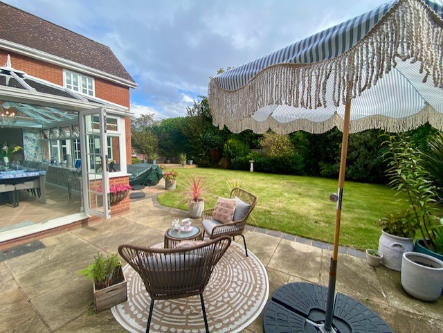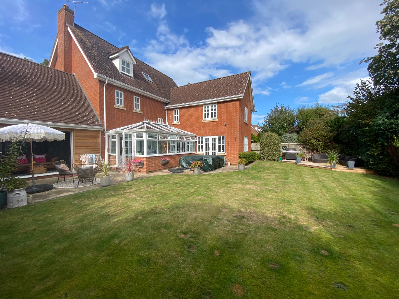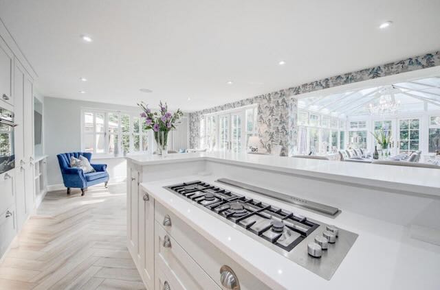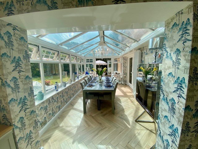• KITCHEN / DINER / SITTING are All modern appliances: double electric oven, 4 ring gas hob, microwave, grill, dishwasher, hot tap, wine cooler, air fryer. Island and 4 high chairs plus Corner sofa, matching stool, smart TV – This opens onto the ORANGERY, with a table and chairs for 10 and patio doors onto the garden.