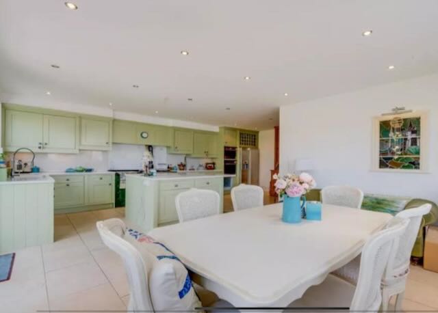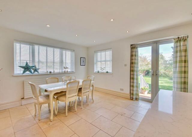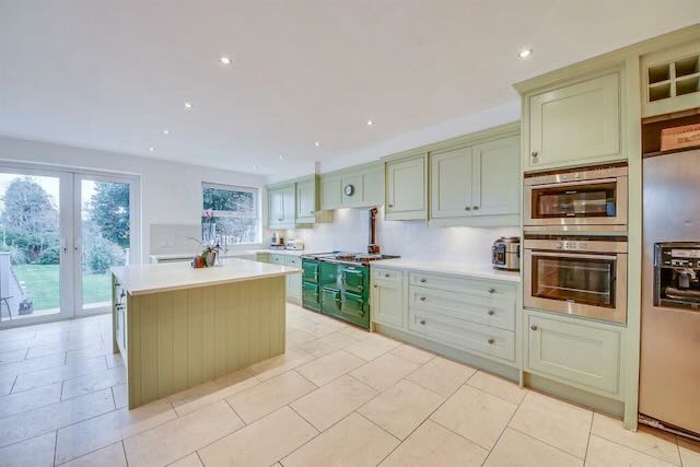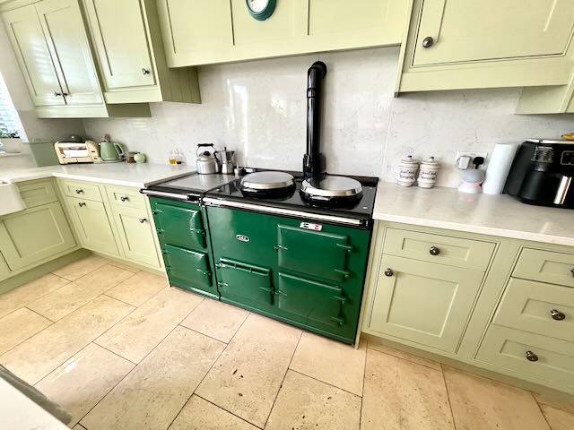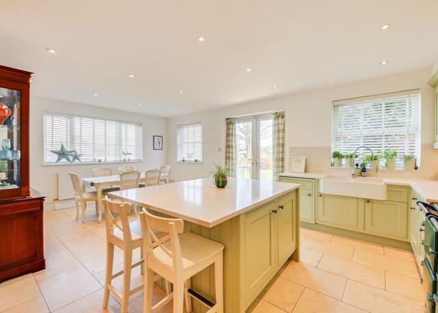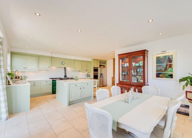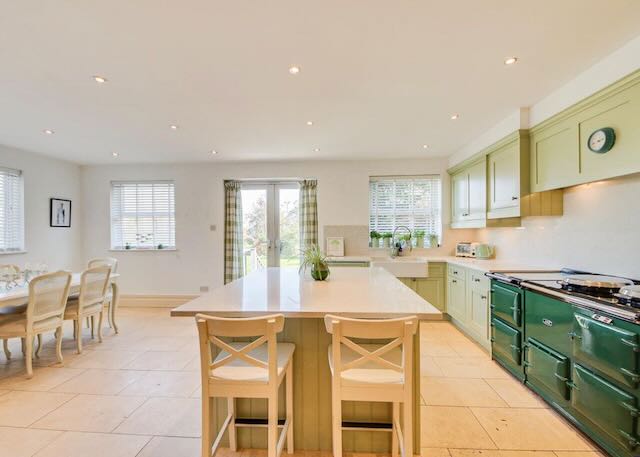 KITCHEN /DINER with all modern appliances including AGA cooker and hob, microwave, dishwasher, island with 2 stools, and table with 6-8 chairs The Kitchen patio door with stairs down onto the rear garden