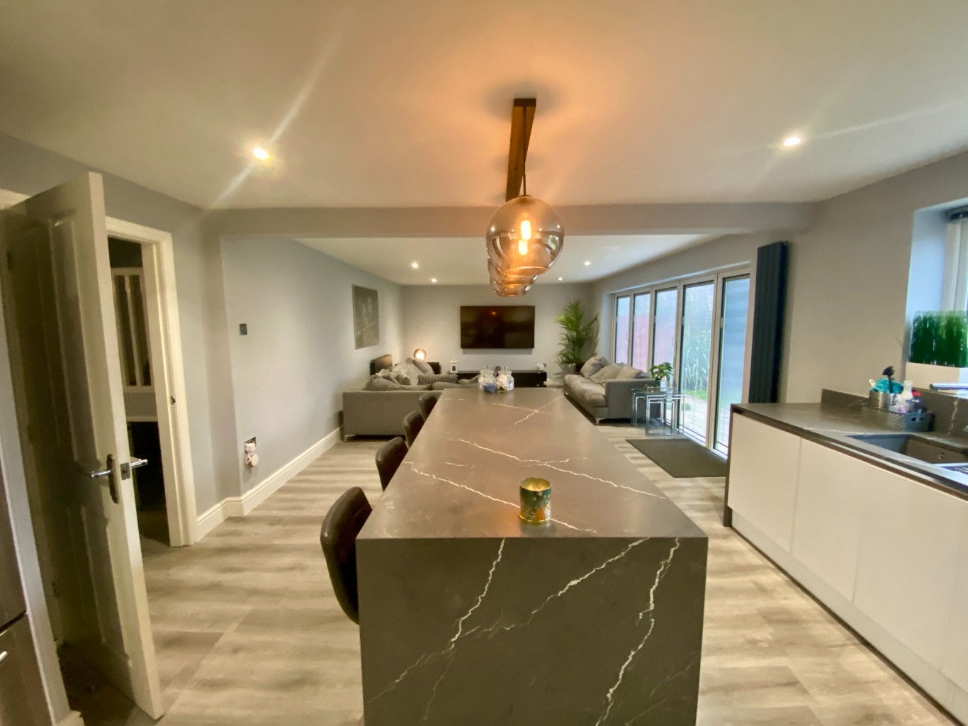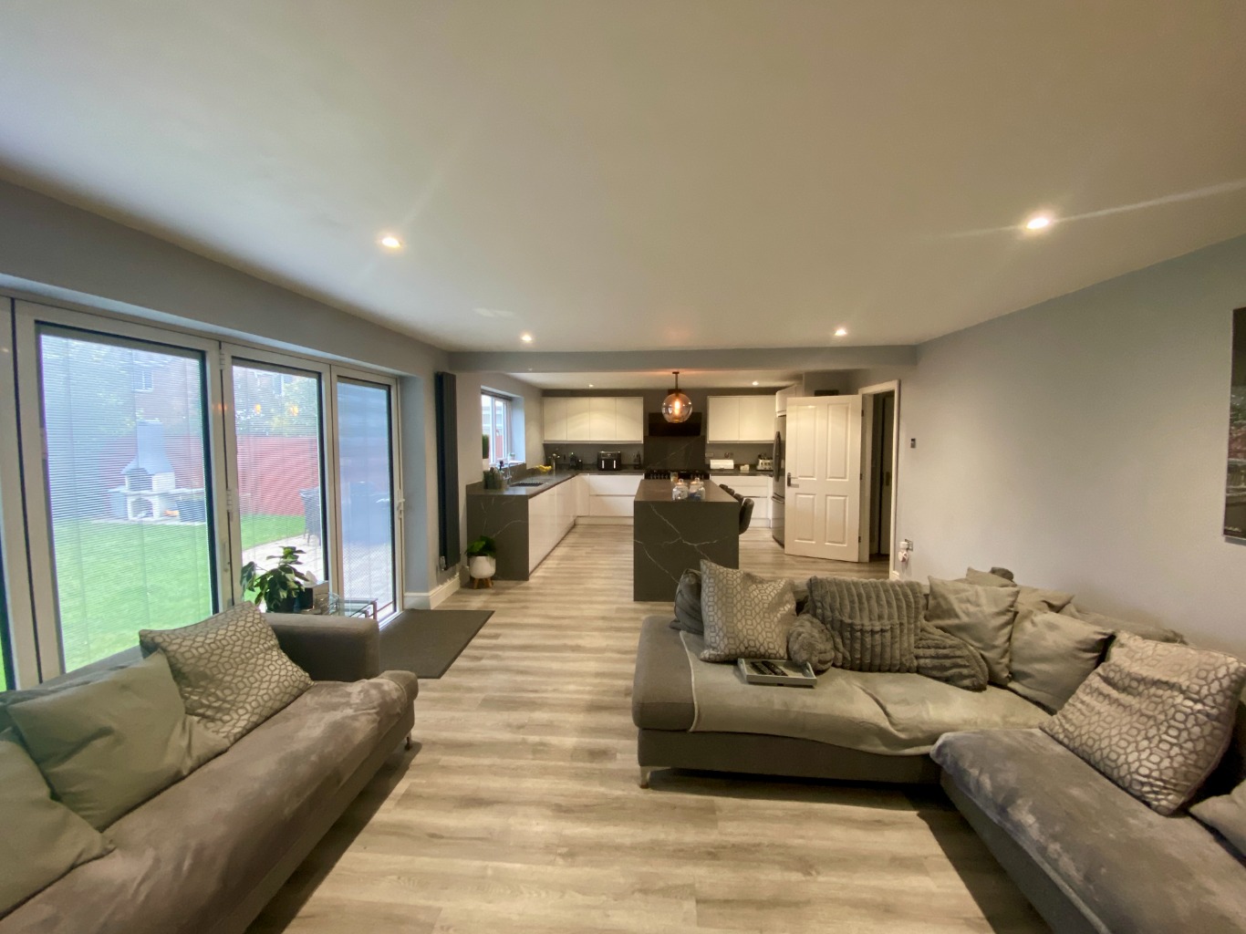 • OPEN PLAN KITCHEN/DINING/SITTING room with all modern appliances including Range oven, 7 ring gas hob, island with 4 high chairs, dishwasher, microwave, grill, hot tap, coffee machine, wine cooler, air fryer, corner sofa for 7, further sofa, smart TV, bi-folding doors leading onto the rear garden.