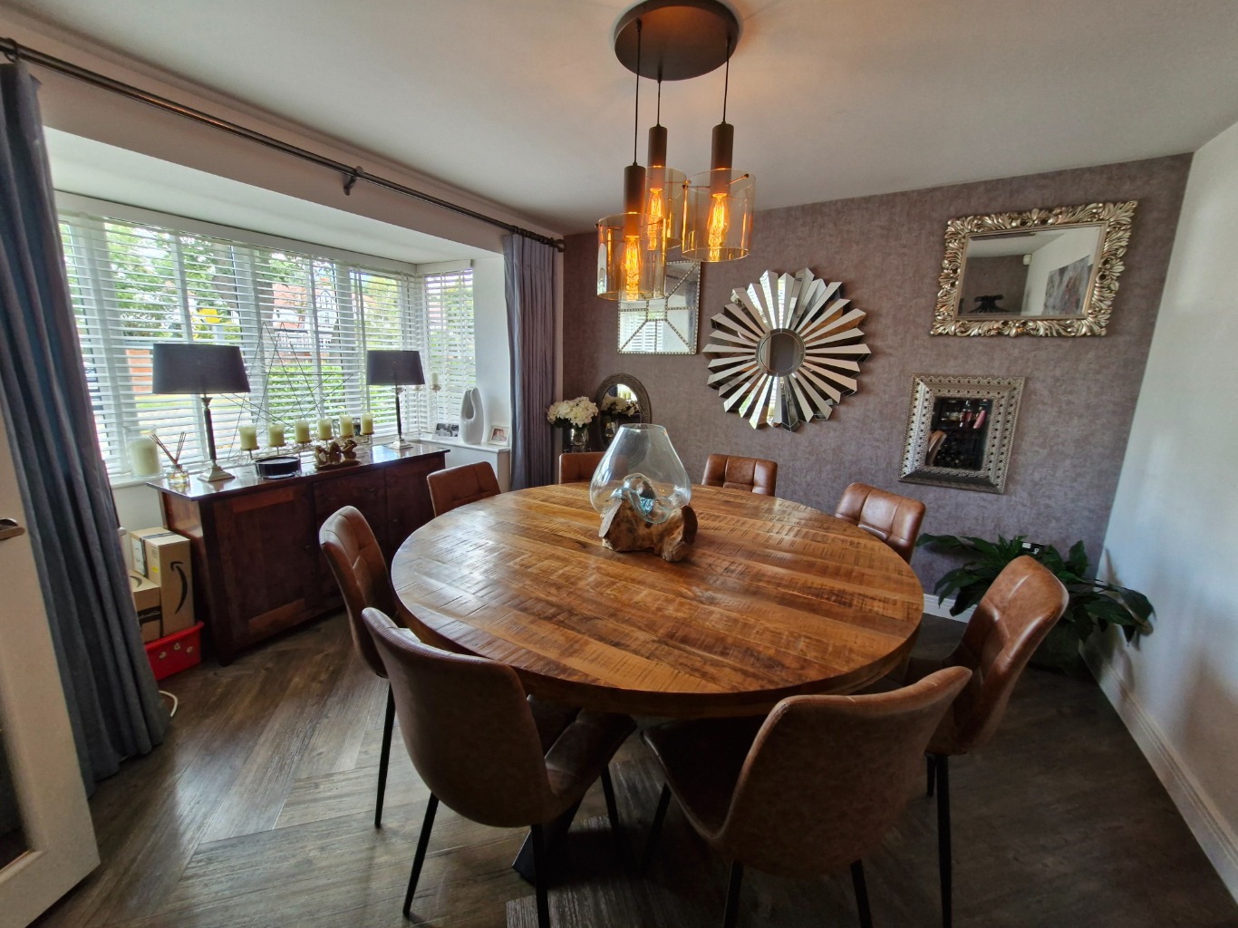 -DINING ROOM has seating for 8, with a large round wood dining table. from SKY TV and has bifold doors leading to the garden.