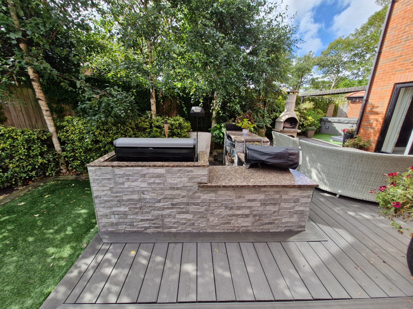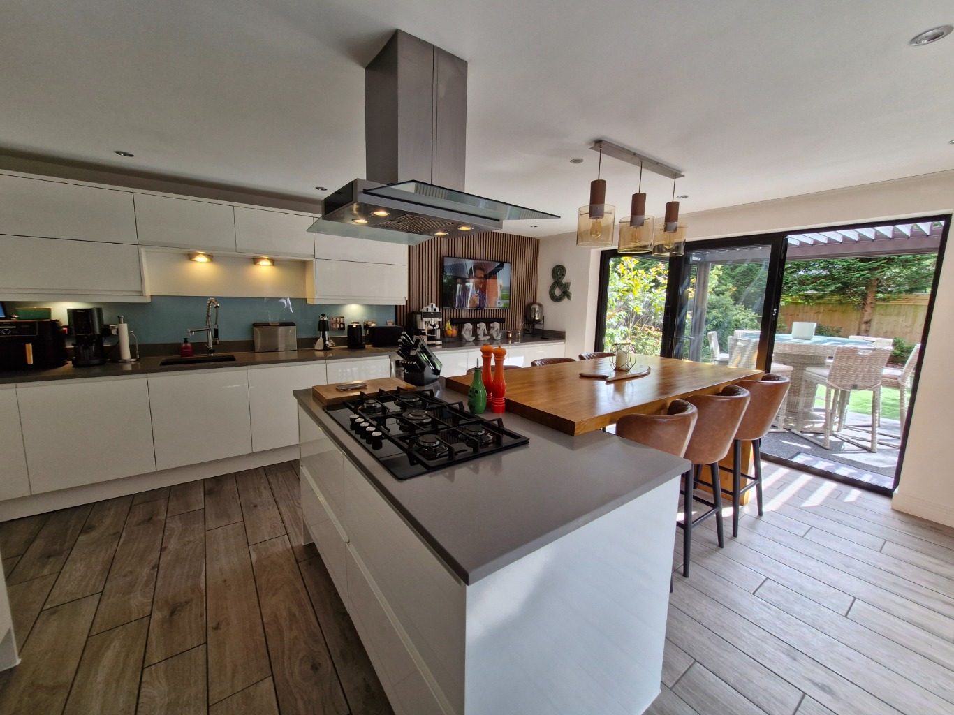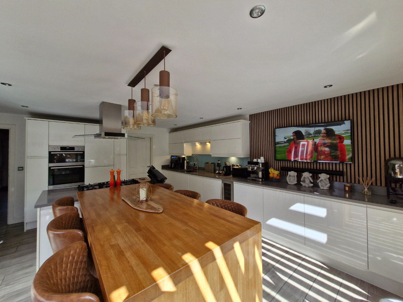 – KITCHEN/DINING includes: Island gas hob, extractor hood, double wall mounted oven, microwave, dishwasher, fridge freezer, coffee machine, washer and air fryer. It has a wood raised dining bar with 6 chairs, and has wall mounted TV. There are bifold doors leading to a beautifully designed garden, with ample seating for outdoor living.