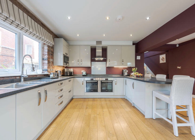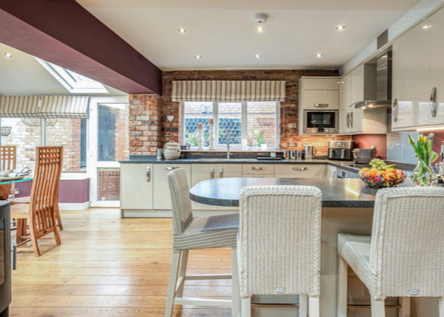 • OPEN PLAN KITCHEN /DINER with induction hob, extractor, double oven, microwave, coffee machine, fridge/freezer, dishwasher, air fryer, breakfast bar, with seating for 4. The kitchen area opens onto a conservatory area with round dining table with 6 chairs which has patio doors onto the rear garden and patio.