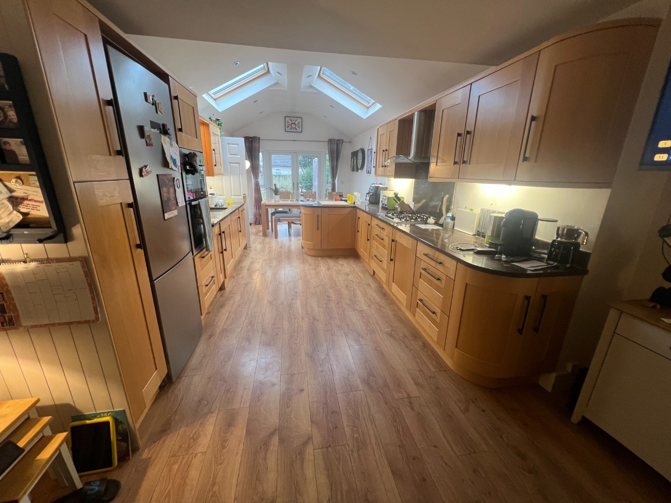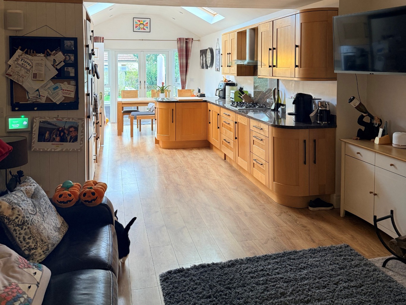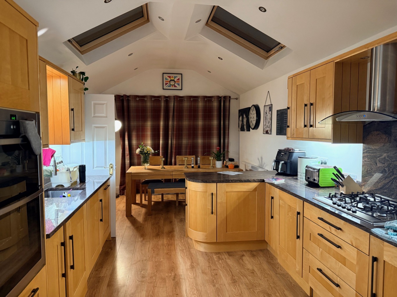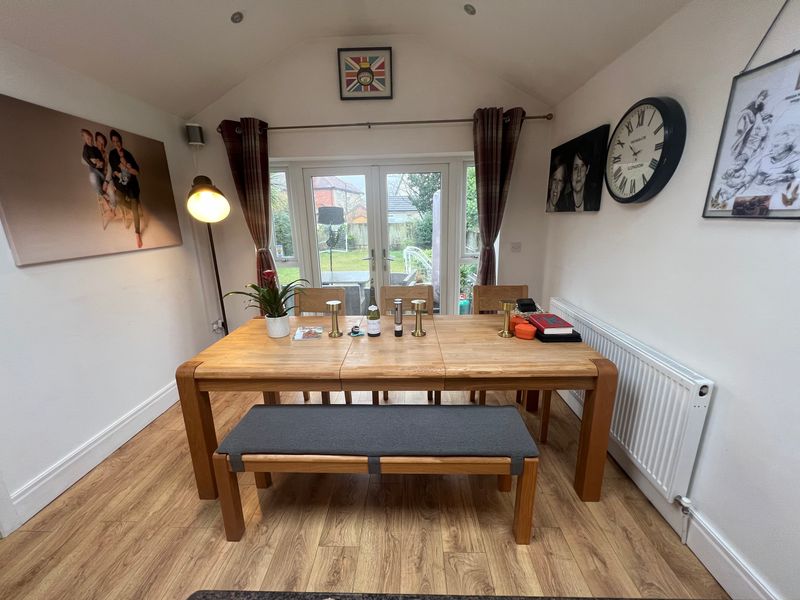– Kitchen/Diner/Lounge: gas hob, double oven, fridge freezer, air fryer, coffee machine, microwave, dishwasher, sky TV, washing machine. There is a dining table with a 3 seater bench and 3 chairs. 3 seater reclining sofa and armchairs, fireplace.