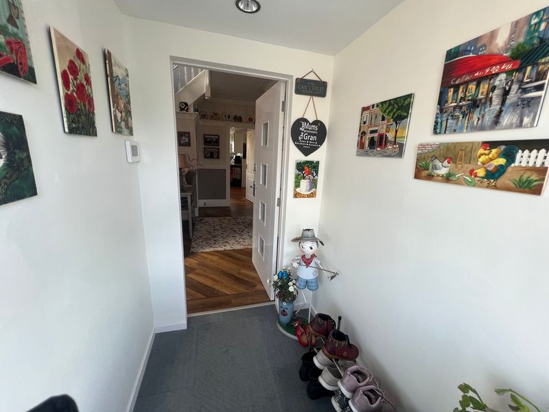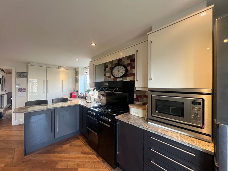Open plan kitchen/diner/lounge with gas range, fridge freezer, coffee machine, microwave, dishwasher, air fryer, washer and dryer. The dining area has a large oval table with 6 chairs. The lounge area has seating for 5 and a TV. There are patio doors to the garden from the lounge/diner areas.