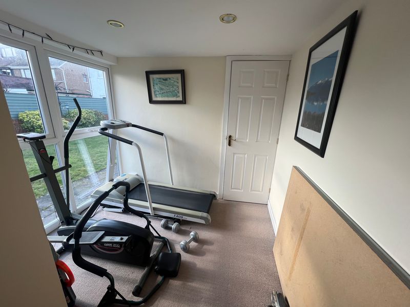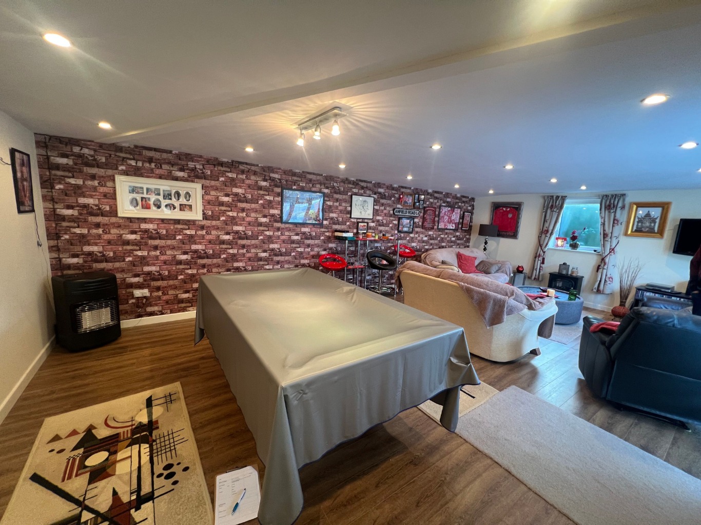 Garden room/bar: with 3 seater sofa, 2 seater sofa, armchair, pool table and gym equipment, wc with basin