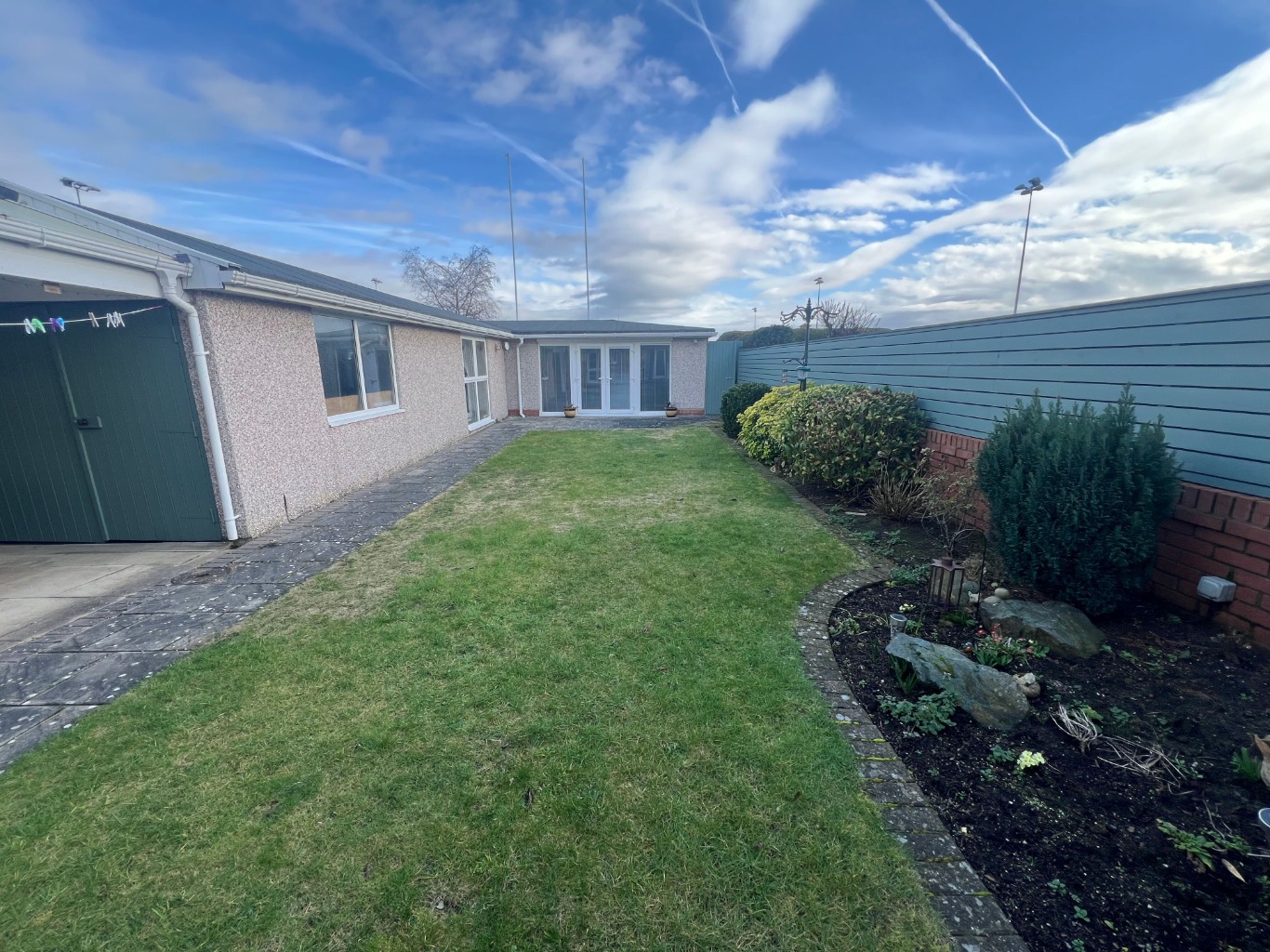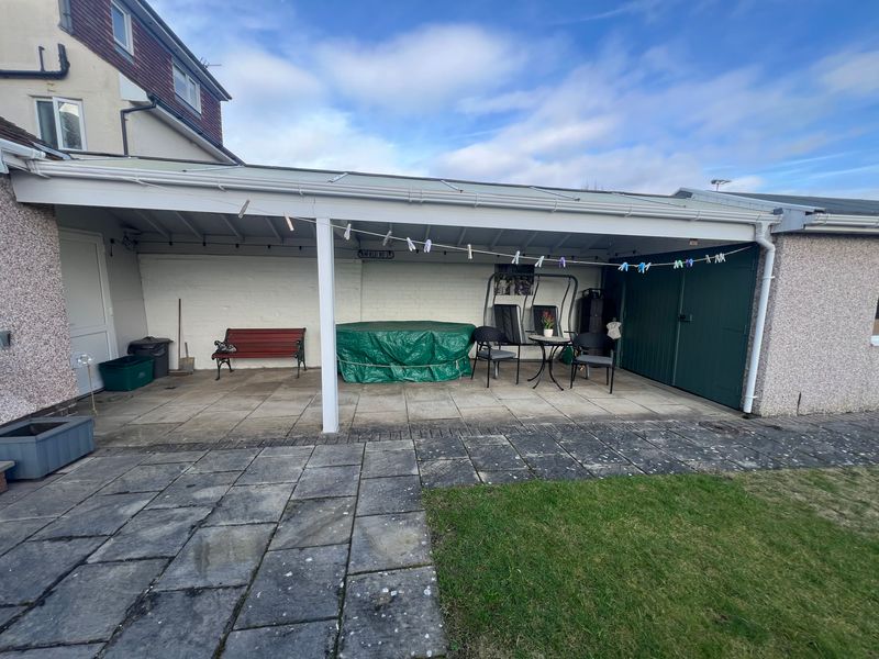 Lawned rear garden with pathway and undercover seating area with table and chairs