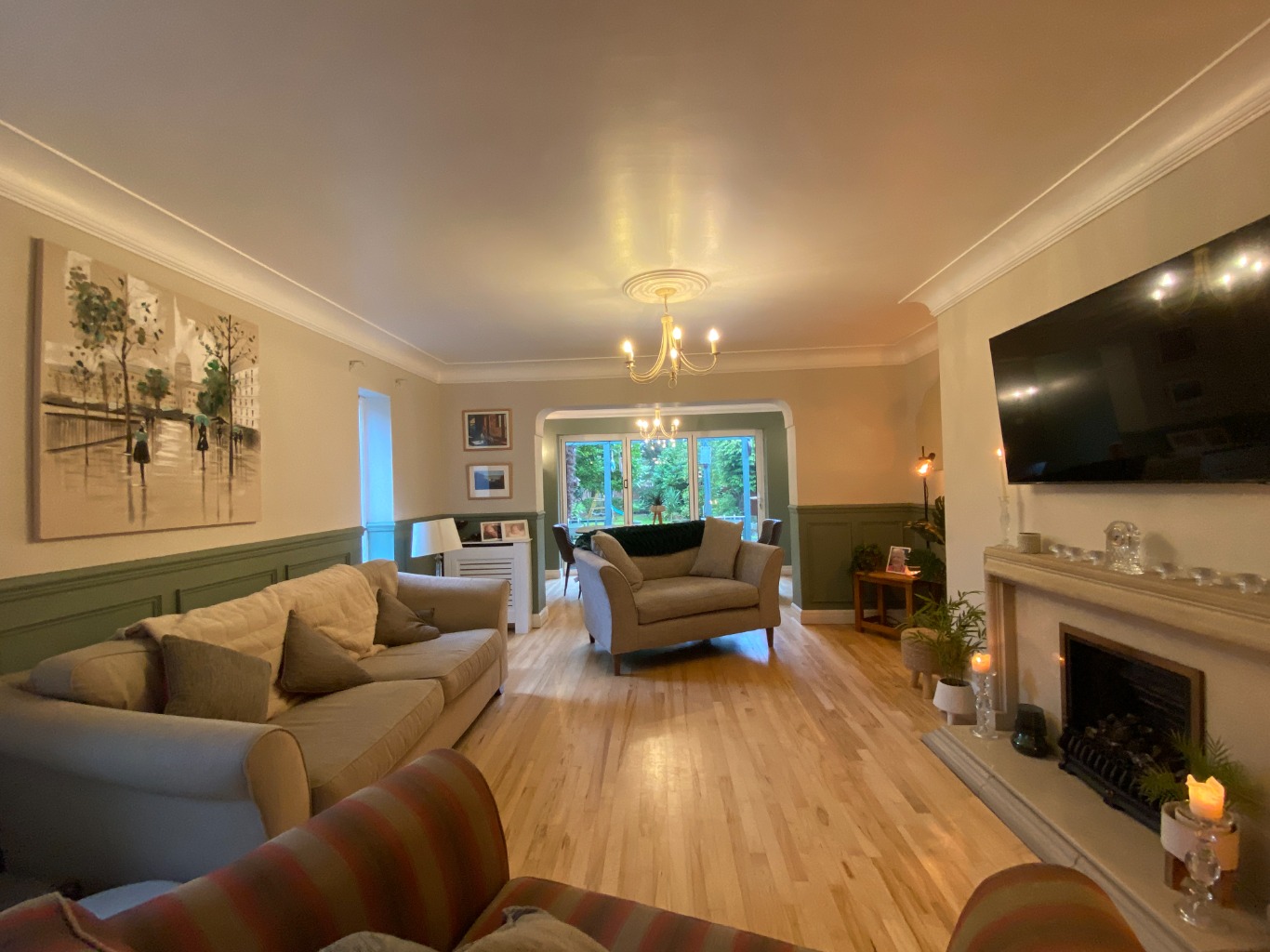 • SITTING/DINING ROOM – sofa, 2 loveseats, table, chairs and bench for 10, concertina doors to the garden, smart TV.