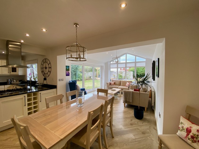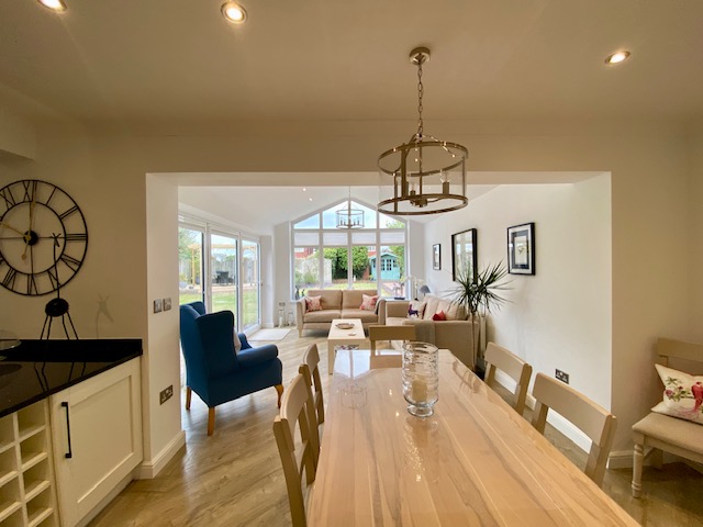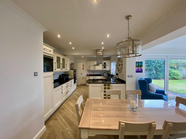 • KITCHEN / DINER / SITTING ROOM open-plan living space including, double electric oven, 5 ring gas hob, microwave, grill, dishwasher, air fryer. Dining table and 8 chairs, 2 sofas, an occasional chair and smart TV, plus bi folding doors opening onto to the rear garden.