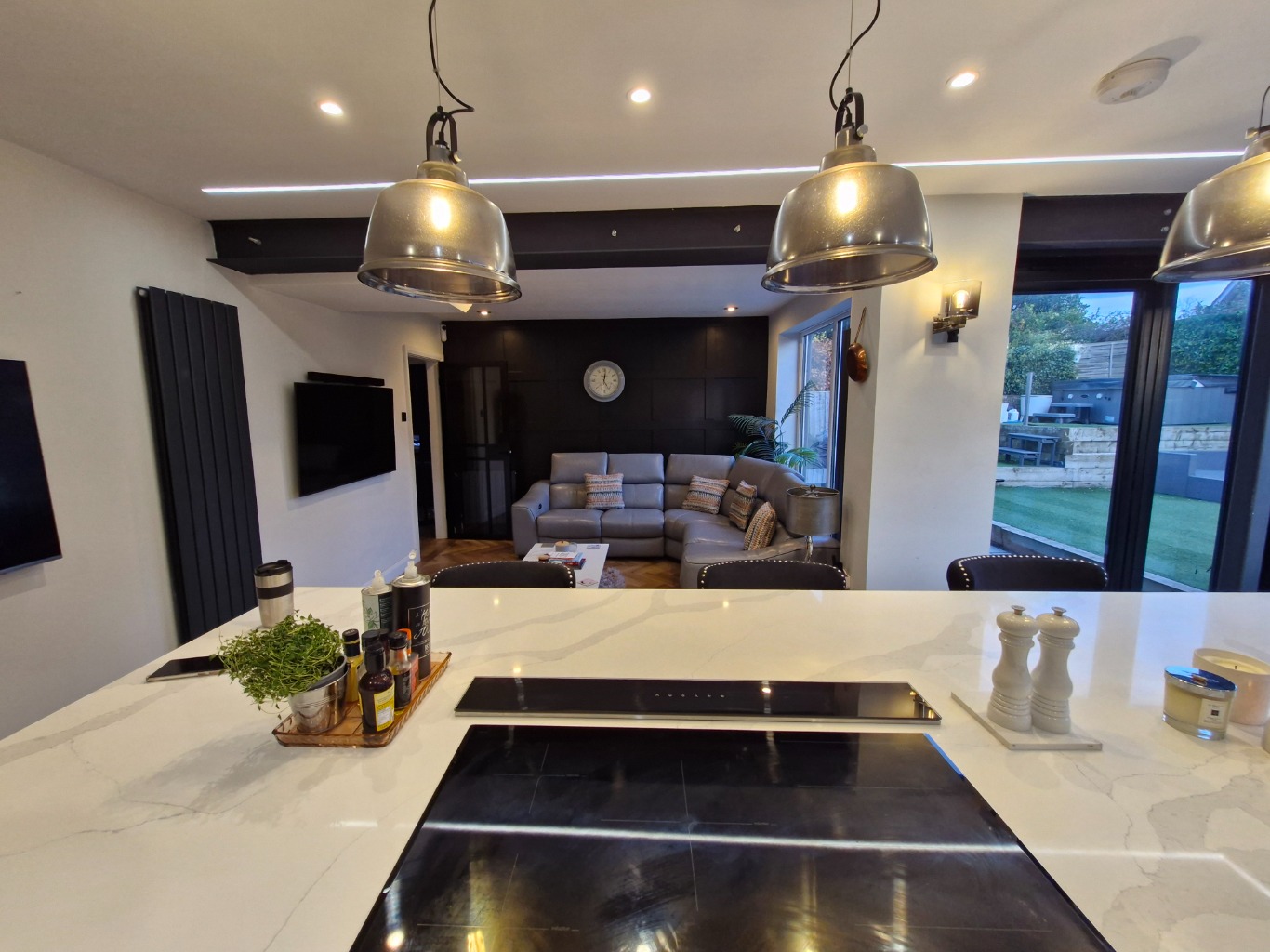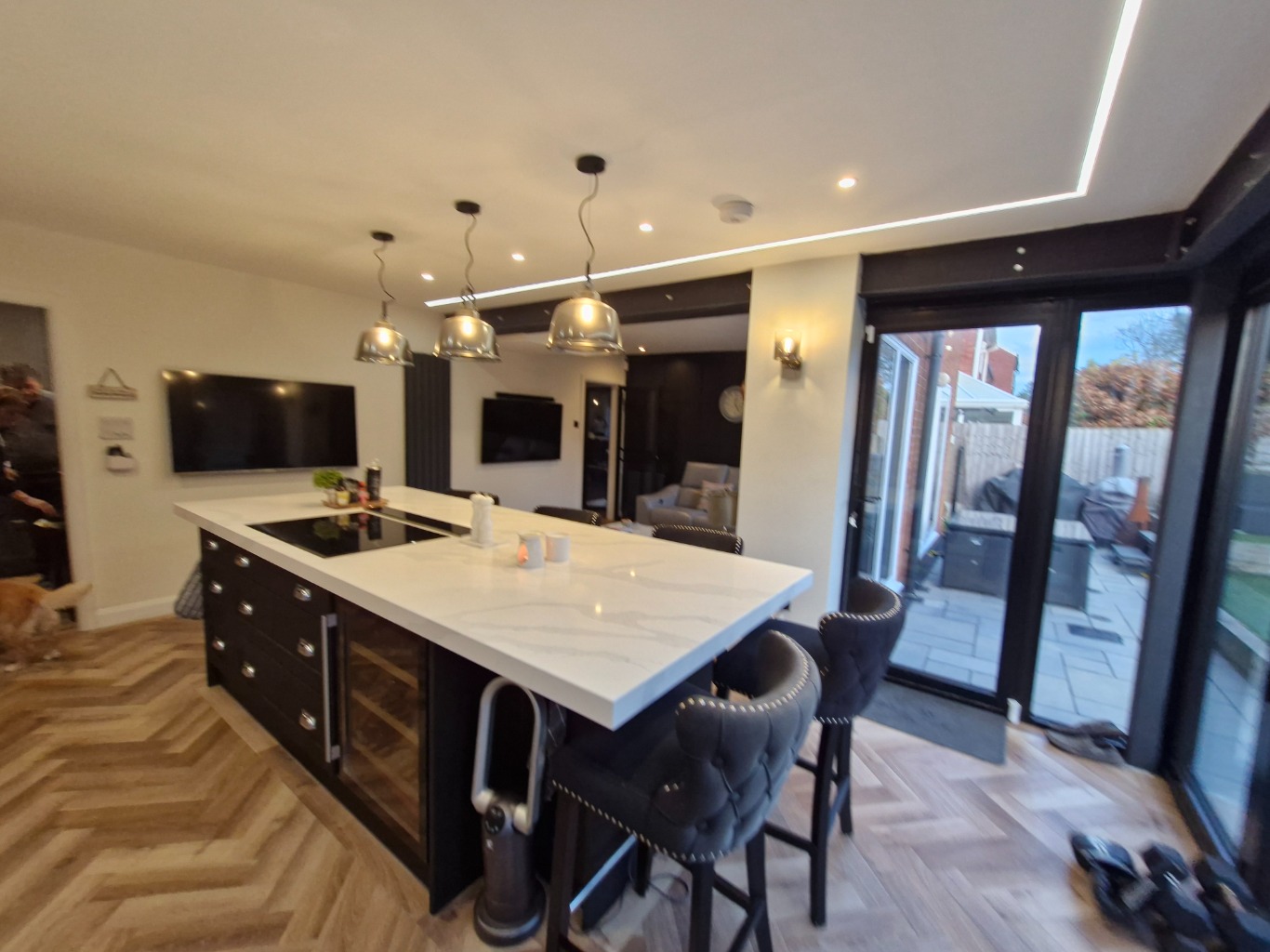 • KITCHEN/DINING/LOUNGE which includes: Induction hob, wall mounted double oven, extractor hood, 2 microwaves, 2 dishwashers, fridge freezer, air fryer and Island with 6 chairs. The sitting area has an L shaped sofa and large wall mounted smart TV and there are bi-folding doors leading onto the enclosed rear patio and garden.