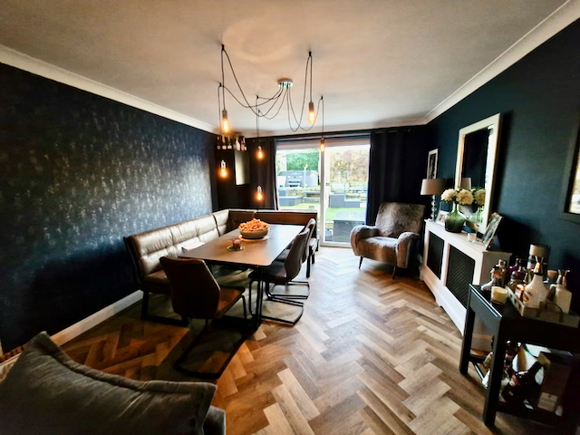 • DINING ROOM: With dining table and 8 chairs plus additional lounge seating for 2 and doors leading out onto the rear patio area of the rear garden.