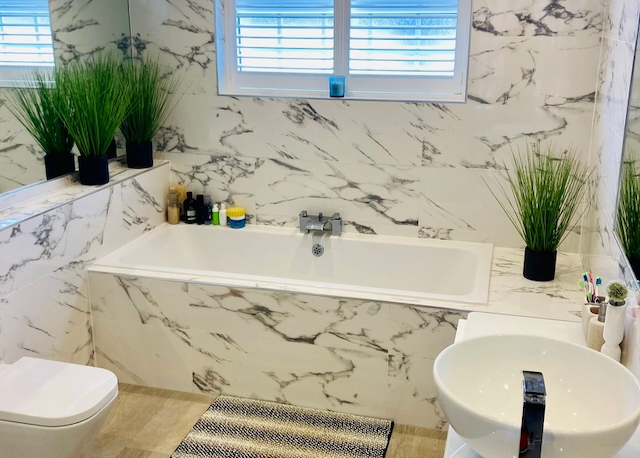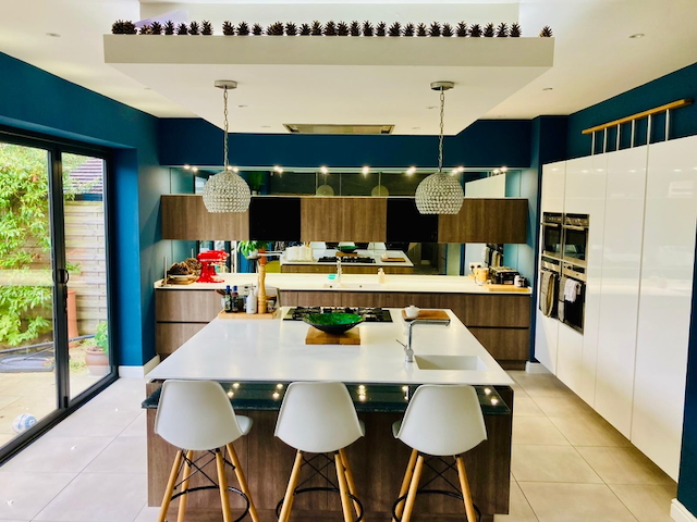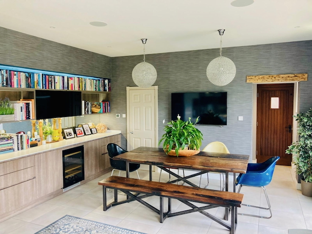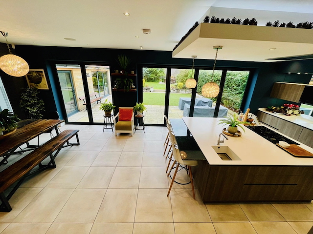 • KITCHEN / DINER INCLUDING: gas hob, double integrated oven, plate warmer and microwave, dishwasher, island with 3 stools and wall mounted TV. There is a large dining table with bench and 4 chairs, and bi-folding doors leading onto the lovely enclosed patio and garden to the rear.