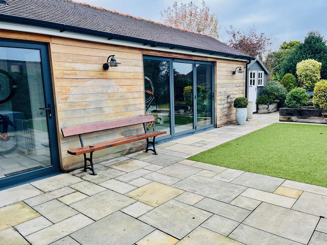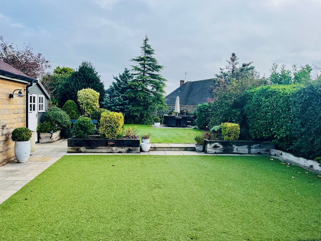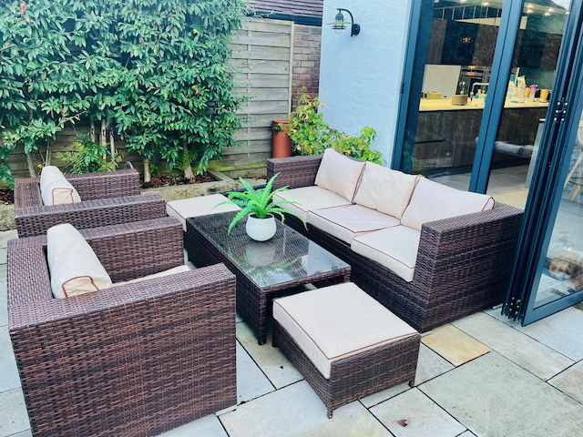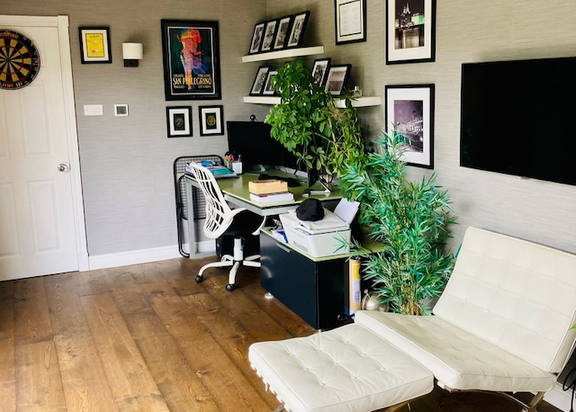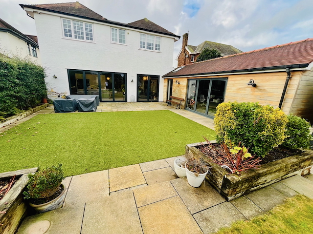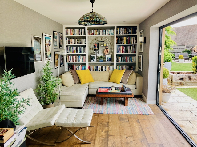 • OFFICE / GARDEN ROOM with L- shaped sofa, wall mounted TV, small desk and chair and bifold doors leading to the rear garden.