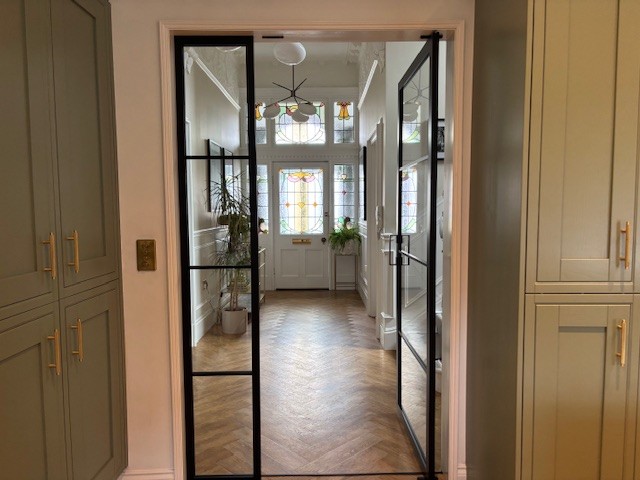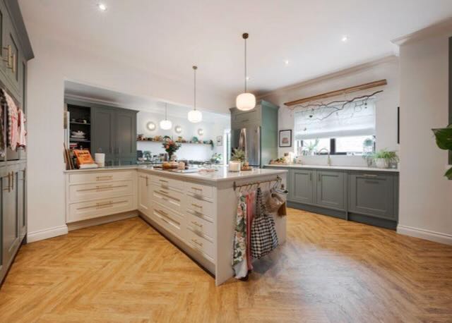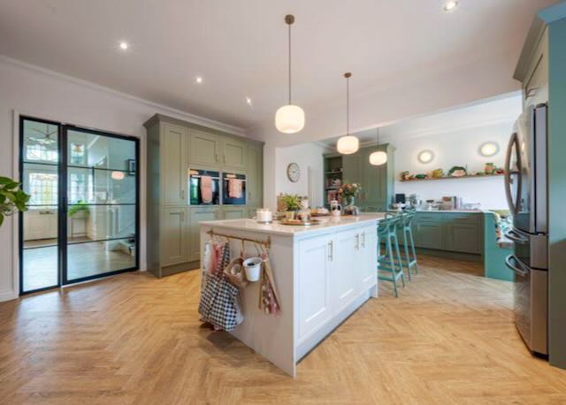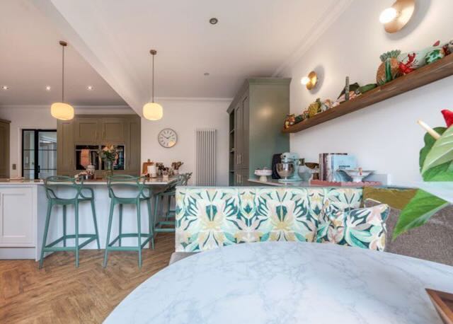 DINING KITCHEN – Glass doors into Large Open plan Kitchen/ diner with bi-folding doors onto the rear patio and garden. There is a large Island with 4 high chairs, 4 ring induction hob, 2 wall mounted ovens, microwave, dishwasher, Coffee machine and small table with built in L shaped bench and wall mounted TV.