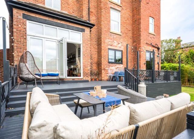Beautifully manicured and private rear garden with a patio area and garden furniture,