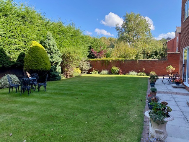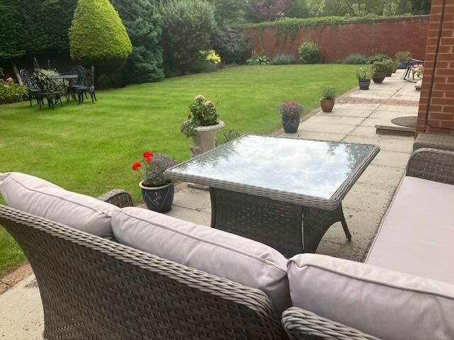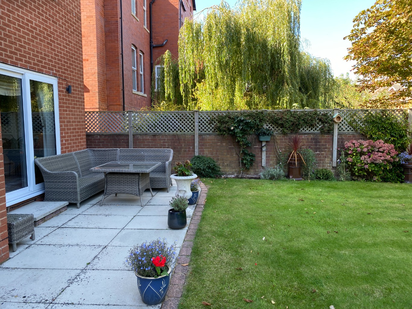 • Patio leading from lounge, communal garden with seating.