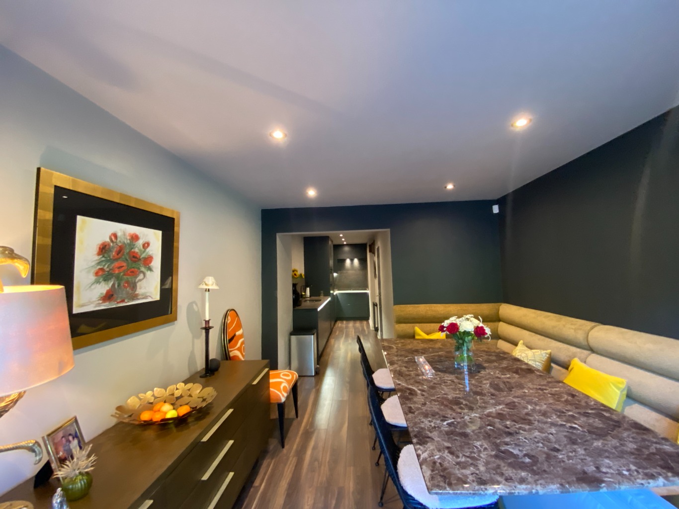 • KITCHEN / DINING ROOM with all the necessary modern appliances: double electric oven, induction hob, microwave, grill, dishwasher, coffee machine. There is a dining table for 10 with corner bench seating and 4 chairs and Patio doors onto a seating area and the communal garden