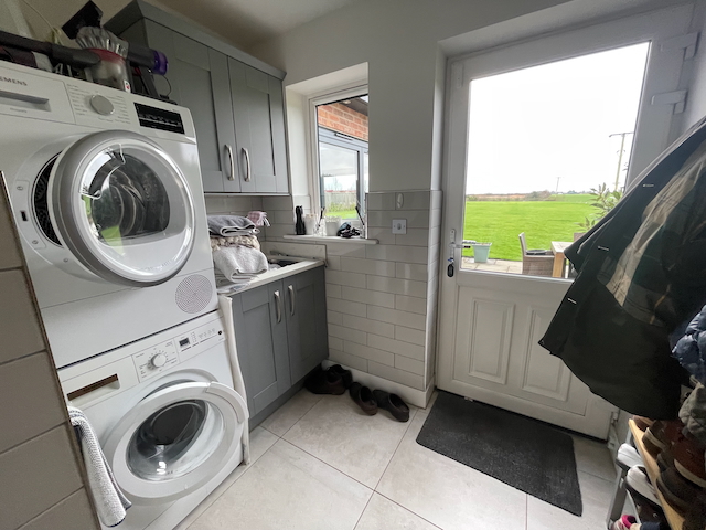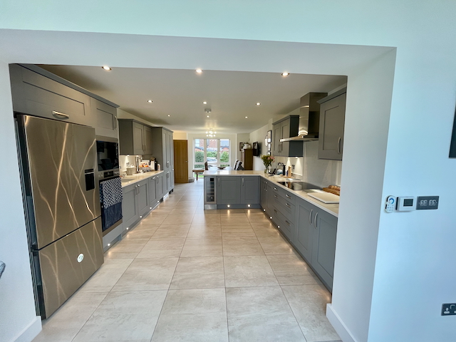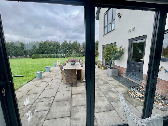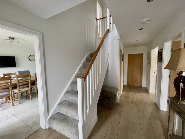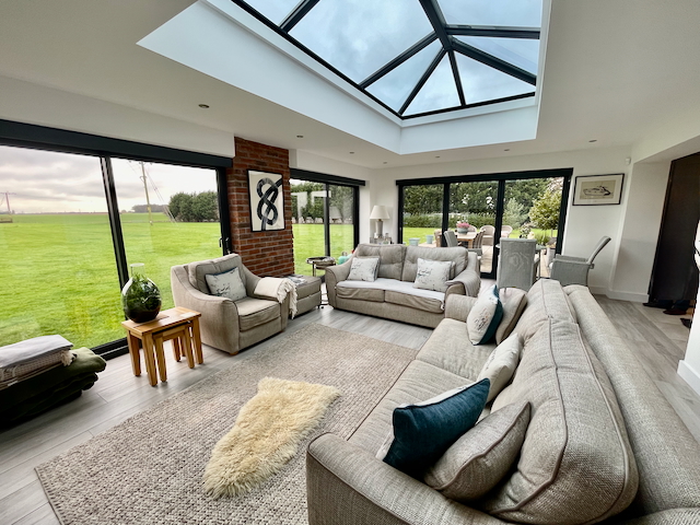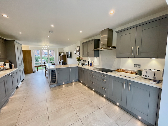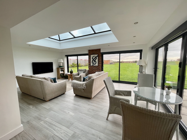• Kitchen/diner/sitting room with all modern appliances including electric induction hob, wall mounted ovens, dishwasher small wine chiller and a table and chairs for 8/10 with both a bench and chairs. The kitchen area opens into a sitting area with sofa, chairs, small table and 2 chairs and wall mounted TV opening onto a rear patio and extensive garden.