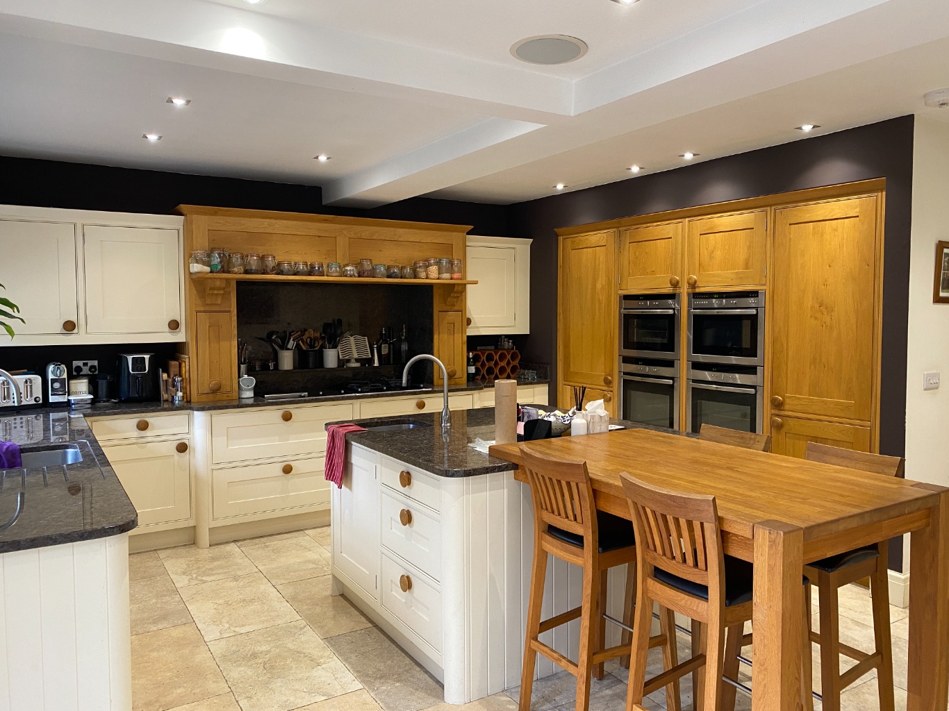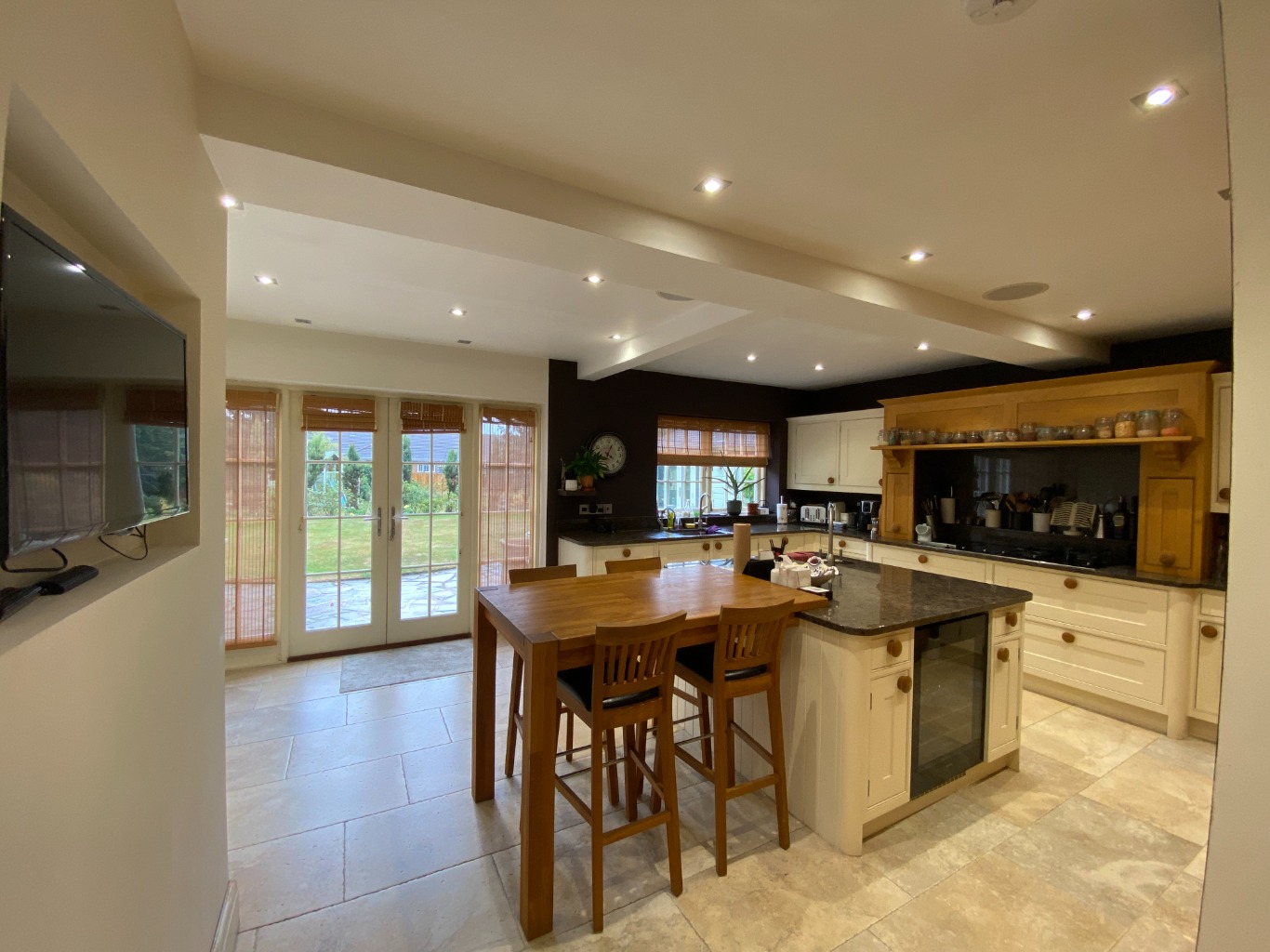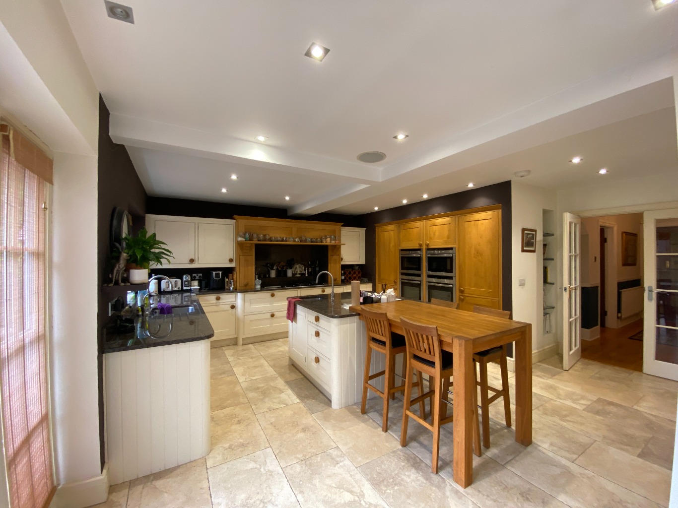 • KITCHEN / DINER –open-plan living space with all the required modern appliances including 4 electric ovens, hob with 3 ring gas burners, 2 induction hobs and a BBQ facility, microwave, grill, dishwasher, 2 fridges, 2 freezers, hot tap, coffee machine, wine cooler, air fryer. High table and 5 chairs off the kitchen island and wall mounted Smart TV.