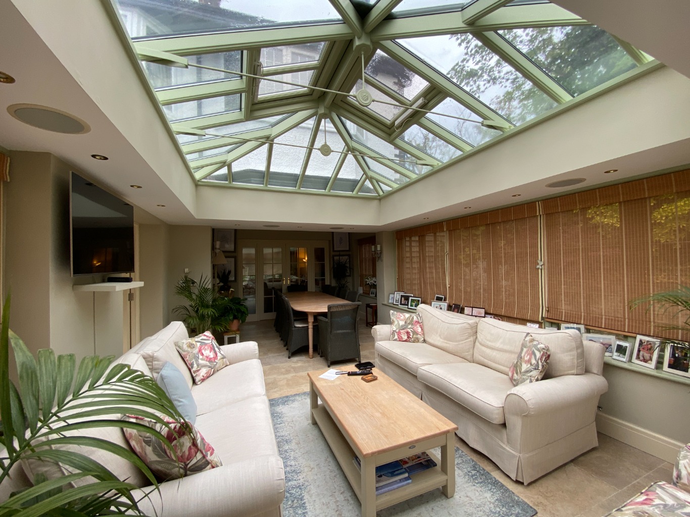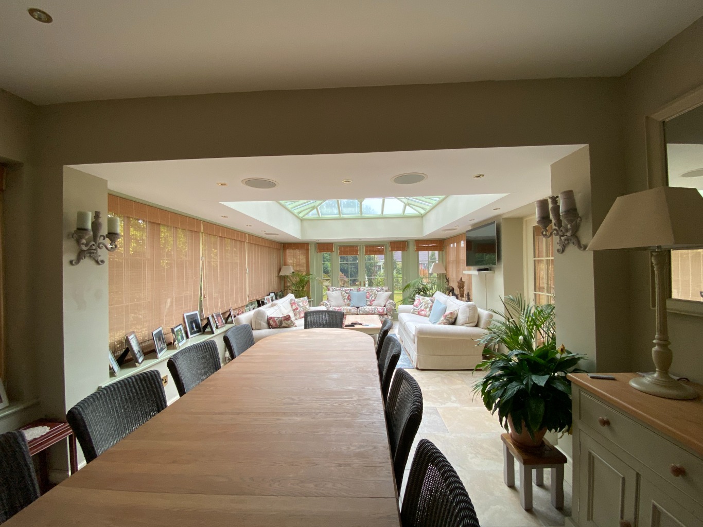 • ORANGERY / DINING ROOM with dining table and 10 chairs, 3 sofas, wall mounted TV and glass doors leading onto the rear garden.